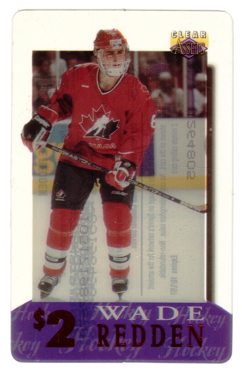 In hockey, Wade Redden is shown wearing a red Team Canada uniform holding a hockey stick, Petr Sykora in a New Jersey Devils red and black uniform skating, and Manon Rheaume in full goalie gear for Tampa Bay Lightning. Auto racing is represented by Dale Earnhardt in a white and black Goodwrench Service racing suit and Mark Martin in a Valvoline sponsored racing outfit.