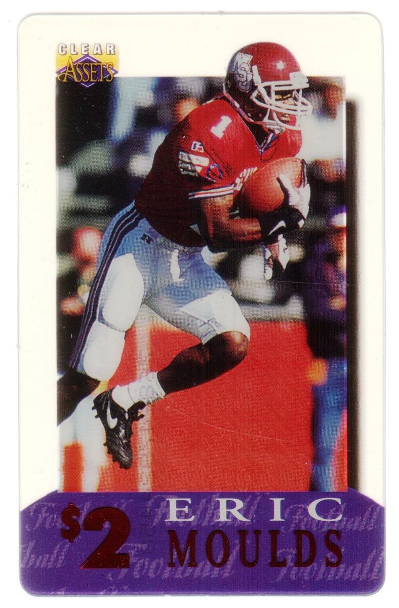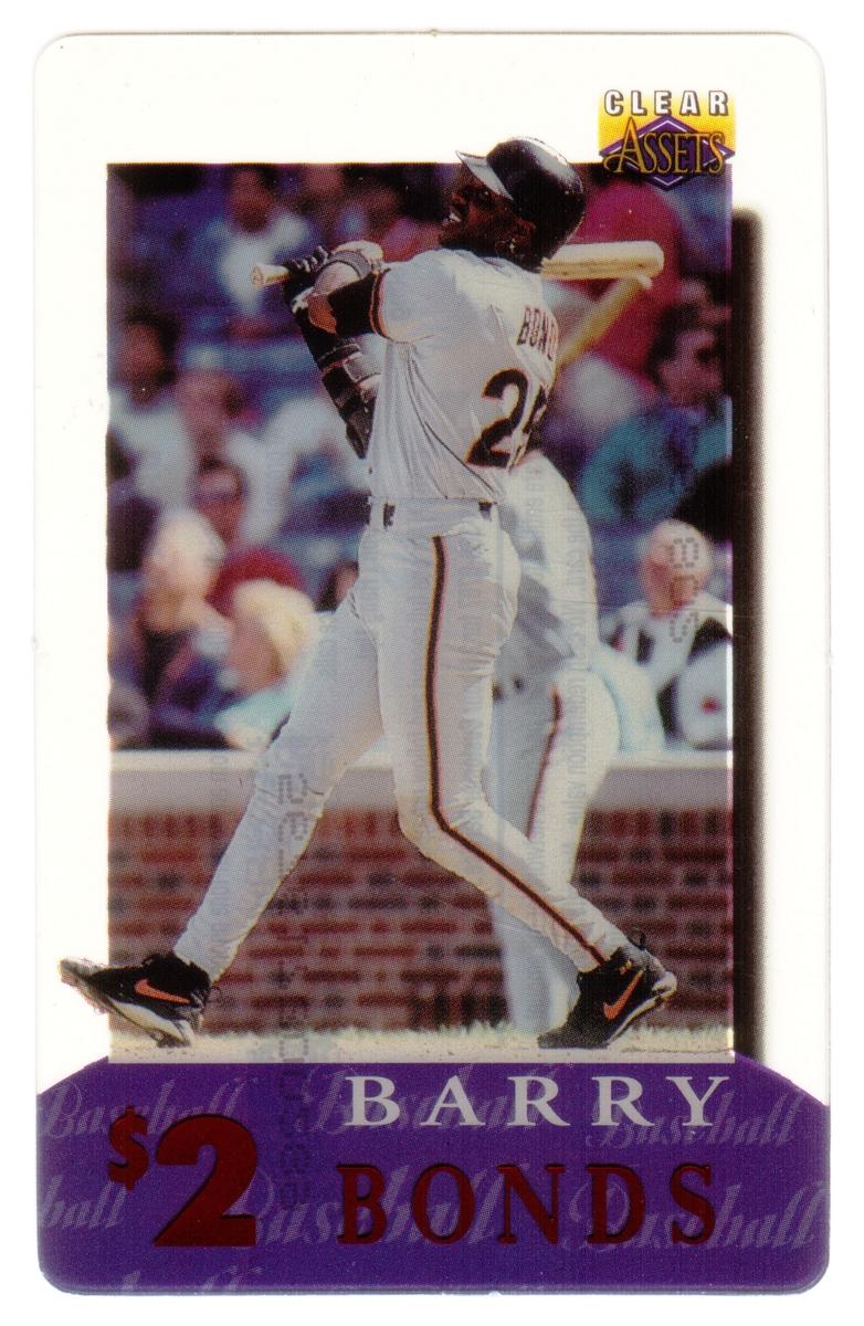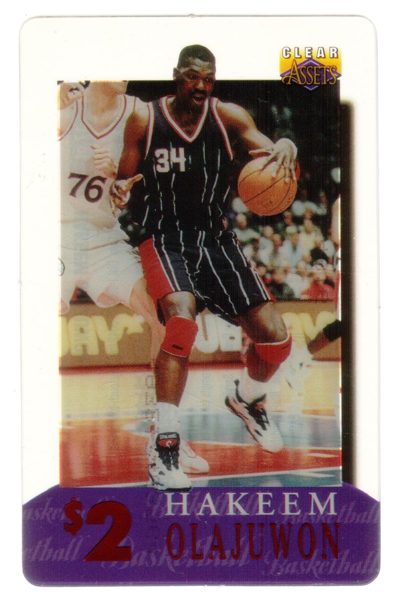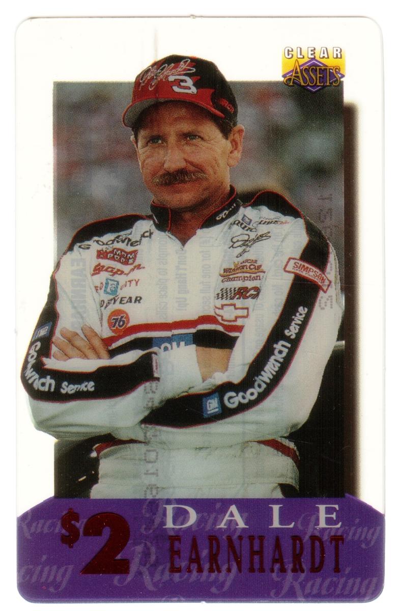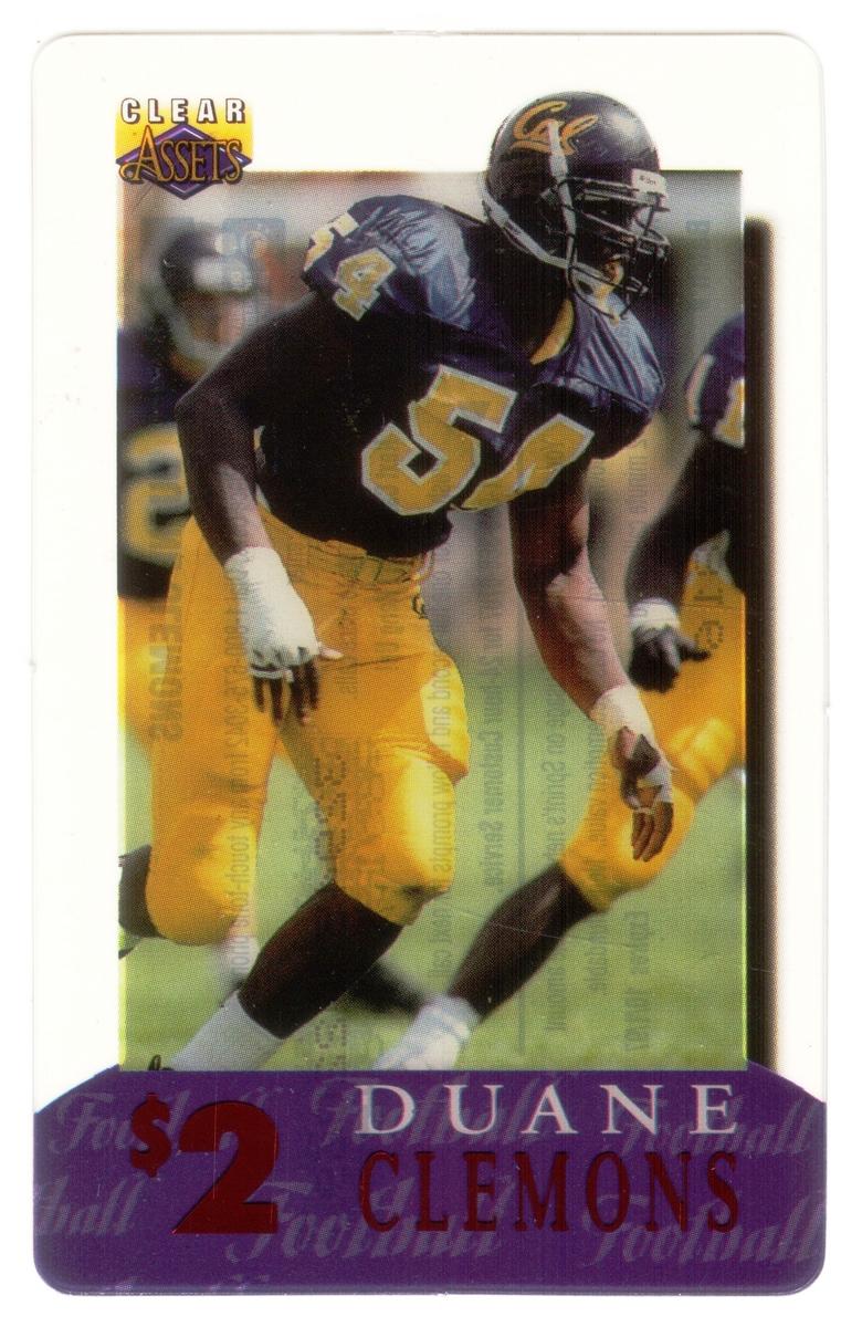 This collection consists of 30 different collectible $2 sports-themed phone cards issued by Clear Assets in 1996. Each card features a photographic image of a well-known athlete in action or posed during their respective sports. The cards represent a variety of sports including football, basketball, baseball, hockey, and auto racing. The Clear Assets logo is placed in the top right corner of each card, while the athlete's name and the $2 denomination are prominently displayed at the bottom on a purple background strip.