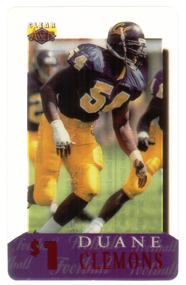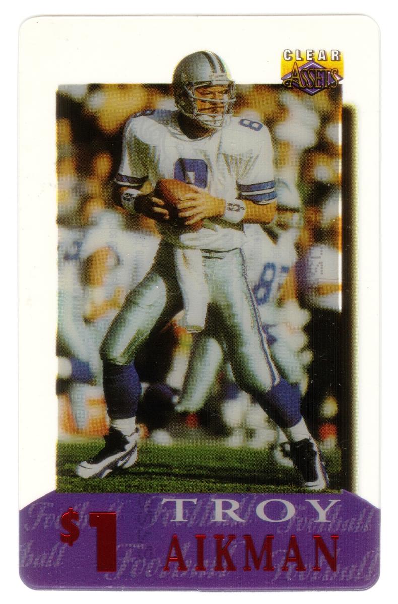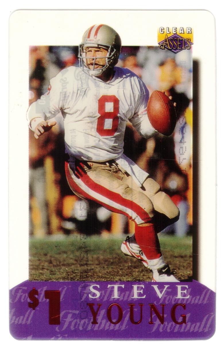 The cards combine sport-specific action shots and posed images, highlighting the athletes in mid-play or focused stances. The design is consistent and clean, featuring the Clear Assets brand prominently and a $1 valuation on every card, confirming their collectible value within the 1996 Clear Assets sports series.