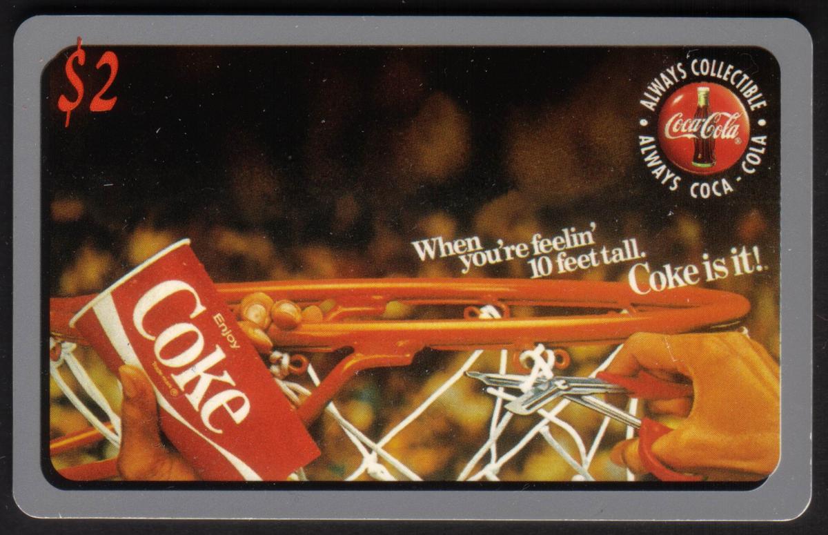 This collectible card features prominent Coca-Cola branding with multiple Coca-Cola logos displayed across the design. The card is themed around basketball, highlighting the sport with imagery that includes basketball hoops and hands actively reaching toward the hoops. The phrase "When You're Feeling 10 Feet Tall Coke Is It!" is clearly shown, emphasizing the connection between the beverage and the uplifting feeling associated with basketball.
