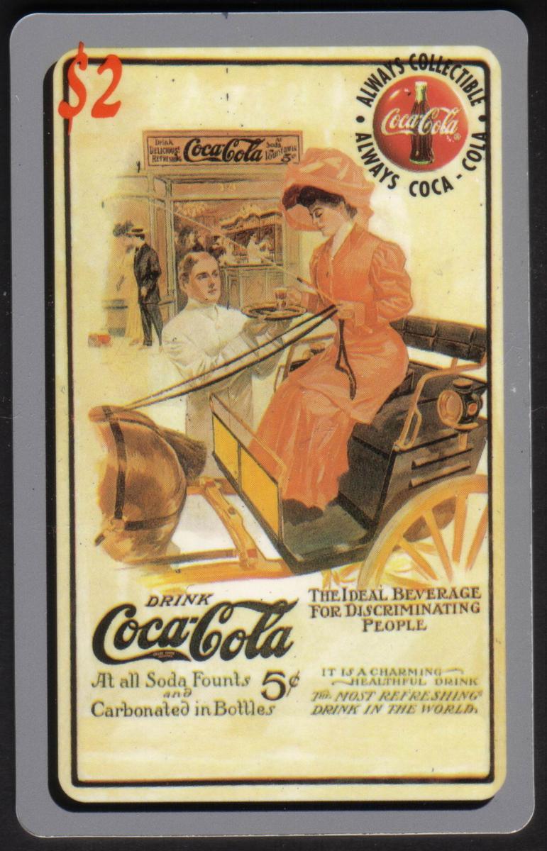 This collectible Coca-Cola phone card features a colorful image of a woman sitting gracefully atop a horse-drawn carriage, representing a scene from the late 1800s to early 1900s era. The carriage is yellow with red wheels, drawn by a single brown horse. The woman wears a wide-brimmed hat and a blue dress with puffed sleeves, holding the reins in one hand. The background of the card transitions from a soft blue sky to pale hues, highlighting the vintage atmosphere.