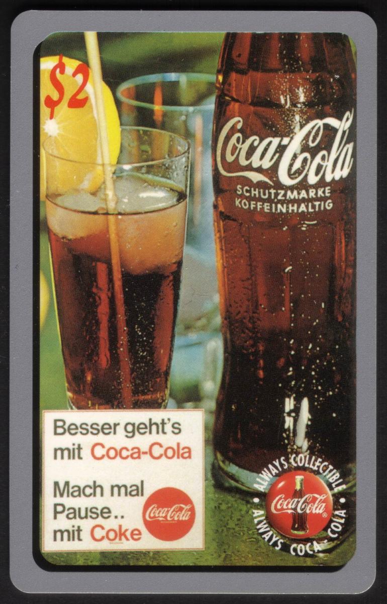 No other characters or figures are present on the card. The composition focuses solely on the Coca-Cola branding elements and beverage images, offering a collectible snapshot of Coca-Cola’s historical marketing presence in Germany. The card is part of a numbered series, making it a valuable piece for collectors interested in international Coca-Cola memorabilia, especially those related to German ad campaigns.