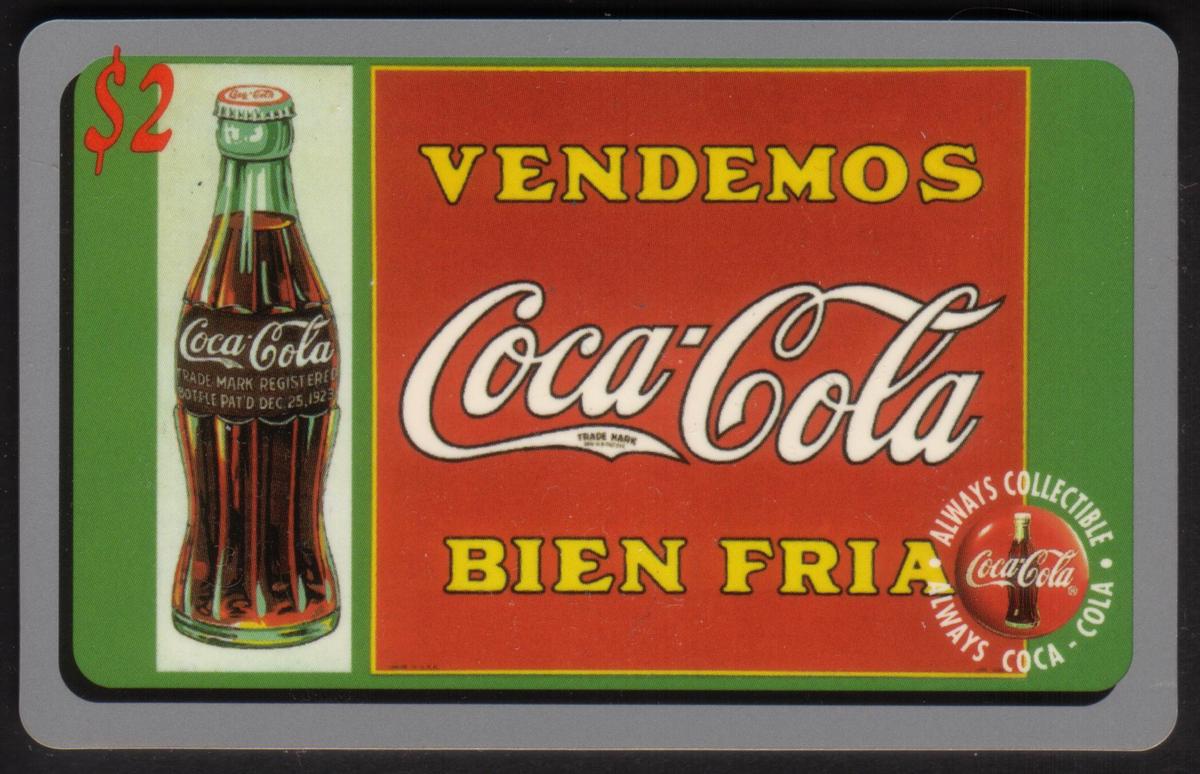This collectible card features prominent Coca-Cola branding with multiple Coca-Cola logos displayed across its design. The card showcases classic coke bottles, highlighting the iconic shape associated with the Coca-Cola product. "Vendemos Bien Fria," a Spanish phrase meaning "We sell very cold," appears along with the image of a single coke bottle, emphasizing the beverage’s refreshing quality. The card is numbered 19 out of a total series of 50 cards, produced by The Score Board Inc. in 1995, indicated by the "$2" price marking and year present on the card.