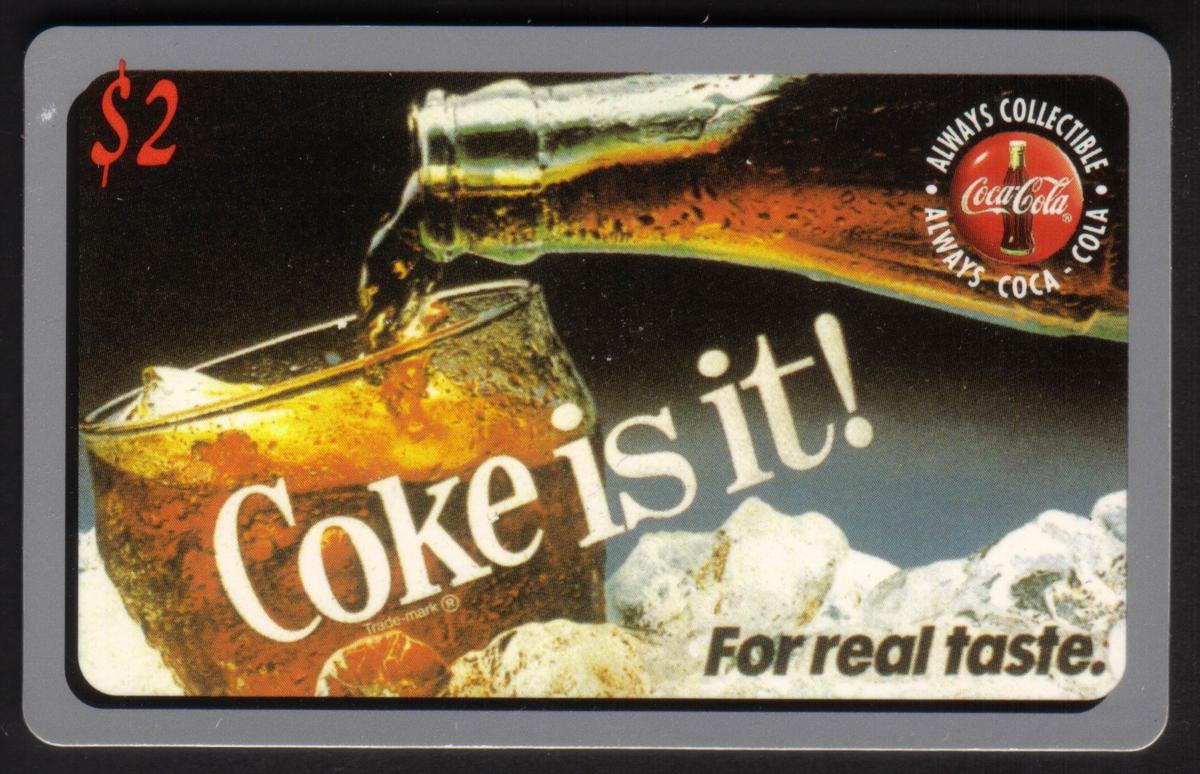 No additional text or names appear on the front of the card beyond the brand-related elements and slogans. The card’s artwork focuses on the bottle, glass, ice cubes, and the recognizable branding of Coca-Cola, making it a collectible item for enthusiasts of Coca-Cola memorabilia and phone card collections.