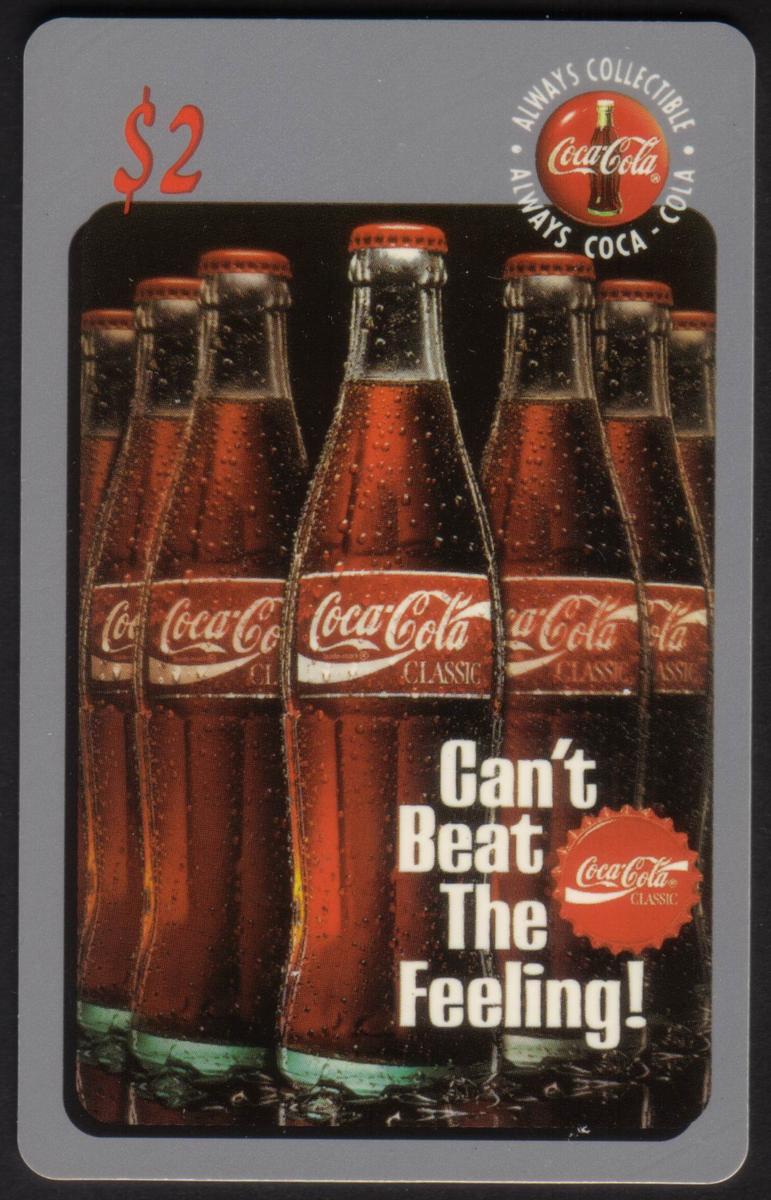 This collectible card features a vibrant Coca-Cola theme centered around the slogan "Can't Beat The Feeling." The design prominently displays seven Coca-Cola bottles arranged in a horizontal row, each bottle showcasing classic red labels with the iconic Coca-Cola logo. Above the bottles, the phrase "Can't Beat The Feeling" is rendered in bold white text on a red background, emphasizing the cheerful and refreshing sentiment associated with the brand.