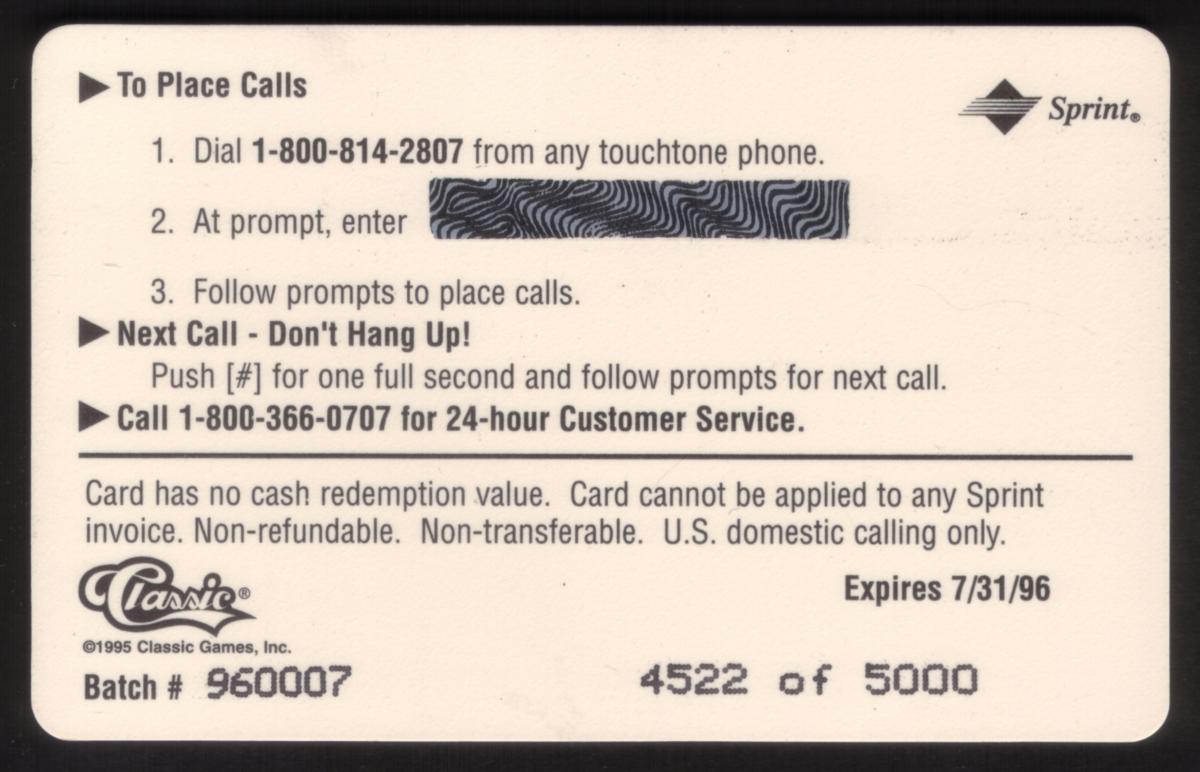 Since we have the world's largest inventory of USA phonecards for collectors, you will not necessarily receive the identical serial/batch/PIN number that we have scanned/pictured.