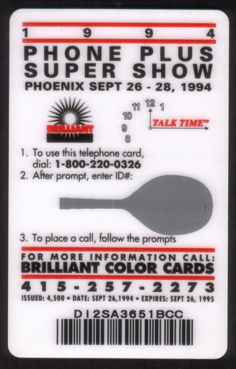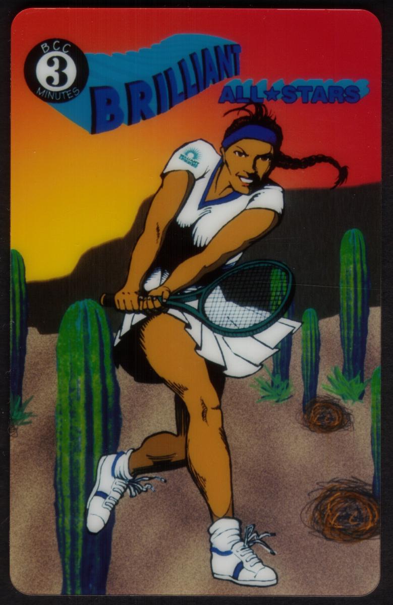 At the top right, the card exhibits the text "BRILLIANT ALL*STARS" in a bold, blue stylized font, with a shadow effect enhancing the lettering's prominence. On the top left is a black circle containing the text "BCC 3 MINUTES," indicating the card's value or usage time. The player’s shirt bears a small logo featuring a cactus, reinforcing the Arizona theme connected to the tennis championships. This card relates to the 1994 Phone Plus Super Show held in Phoenix, Arizona, and celebrates women's tennis through dynamic, artistic design.