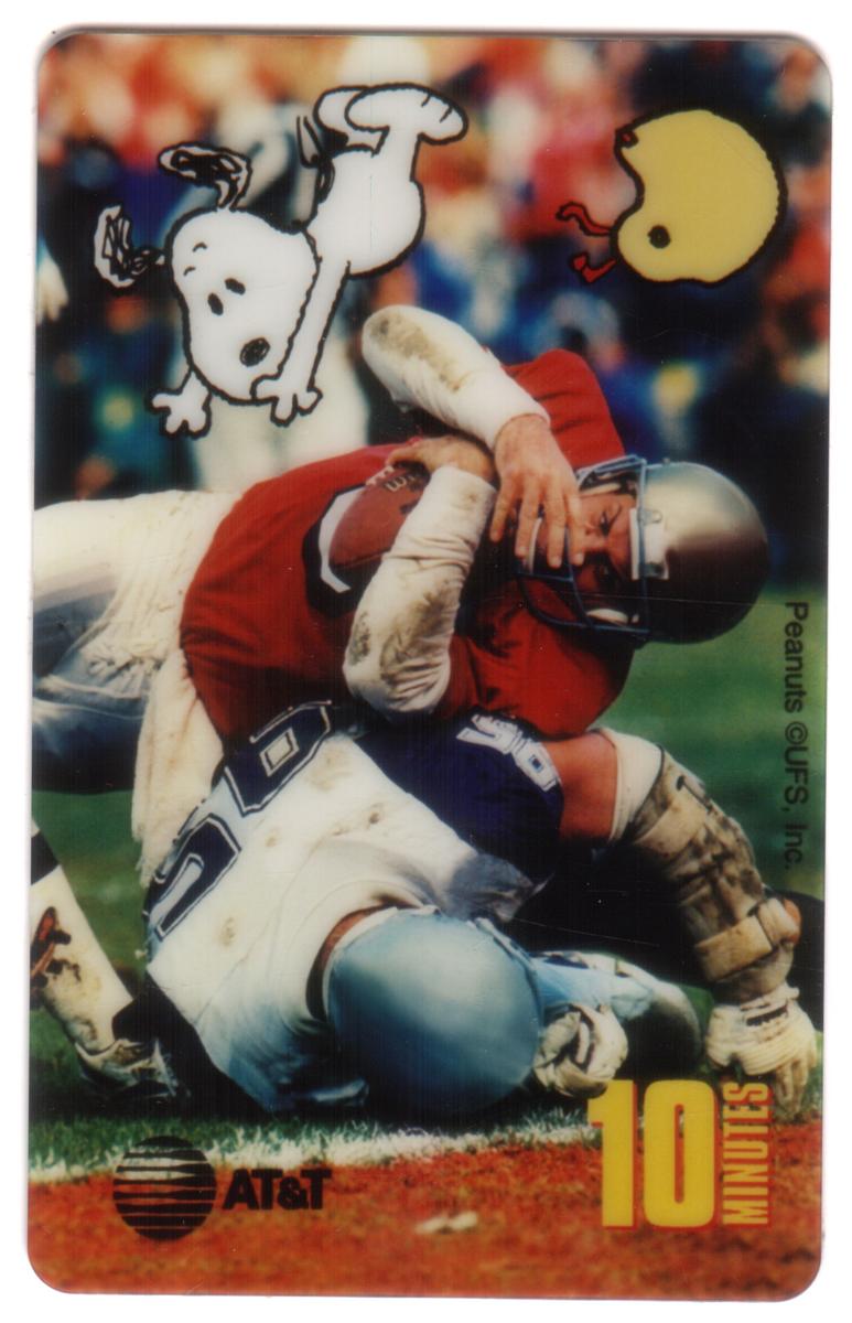 Set of 1995 collectible phone cards featuring vintage football action and Peanuts characters like Snoopy and Woodstock, with vibrant colors and retro design. |
