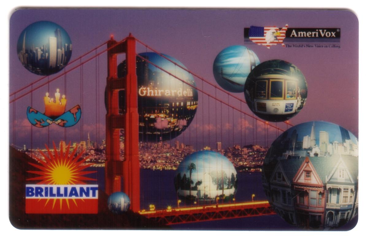 In the top right corner of the card, the AmeriVox logo is visible alongside a stylized American flag, emphasizing the card’s connection to a United States-based telephone service. Near the bottom left, the word "BRILLIANT" appears in bold uppercase letters with a bright sunburst design behind it. Above this, a blue and gold crown symbol with the number 4 is shown, adding a decorative element to the overall design. The card’s artistic style blends real photographic elements with fantasy-like reflective spheres to highlight notable aspects of San Francisco.