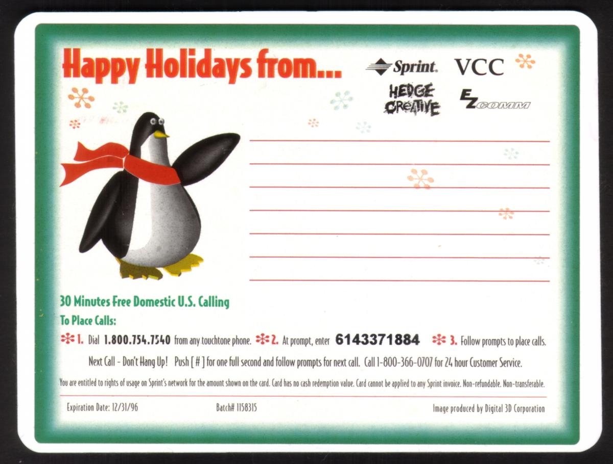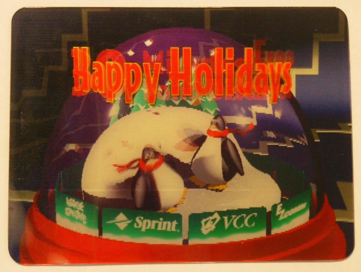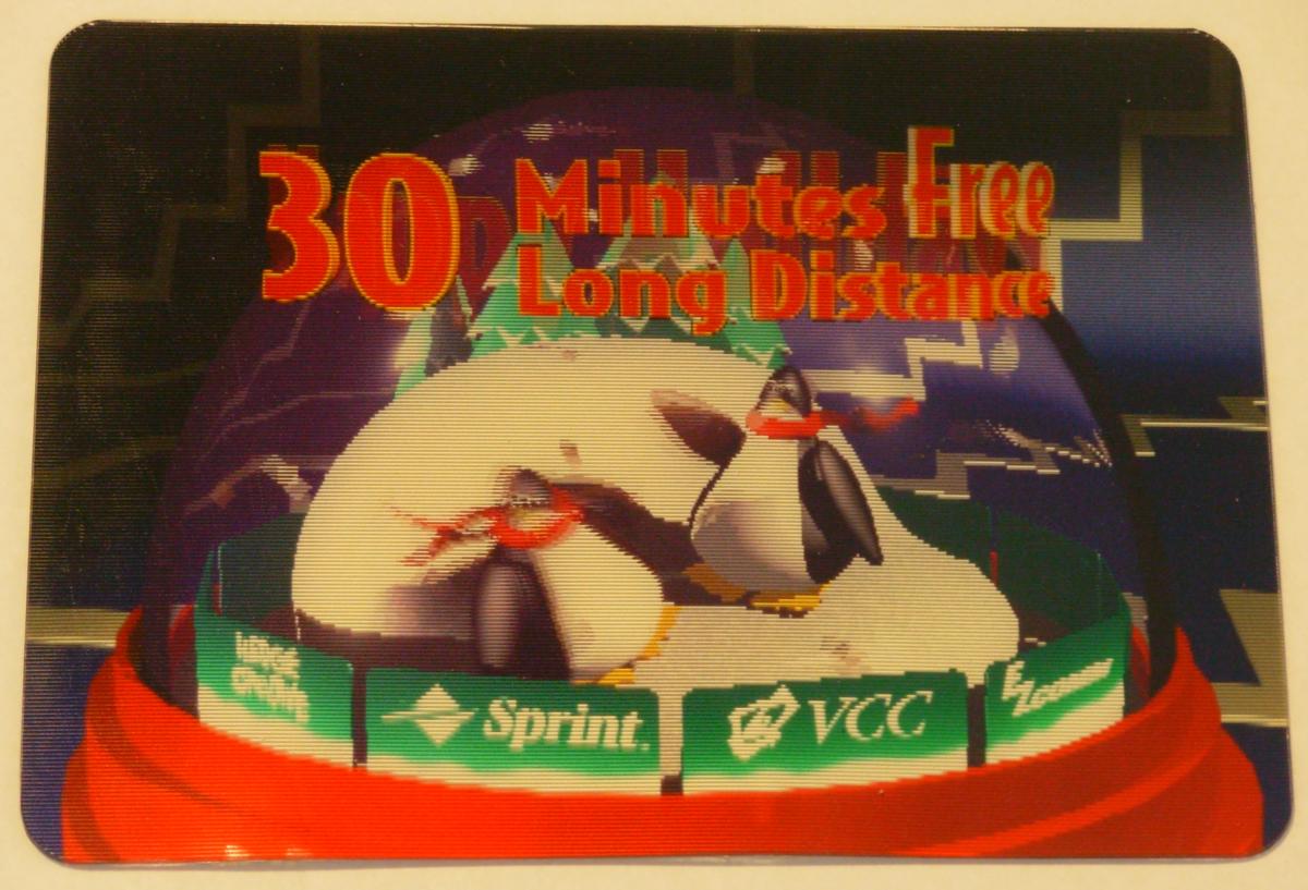 This 1995 holiday promotional card, created by Digital 3D Corporation with collaboration from Sprint, VCC, and Hedge Creative, comes with a 30-minute free service offer mentioned in the keywords. It is a lenticular collectible designed to appeal to holiday collectors and fans of seasonal animated themes, specifically highlighting Christmas and winter animals like penguins.