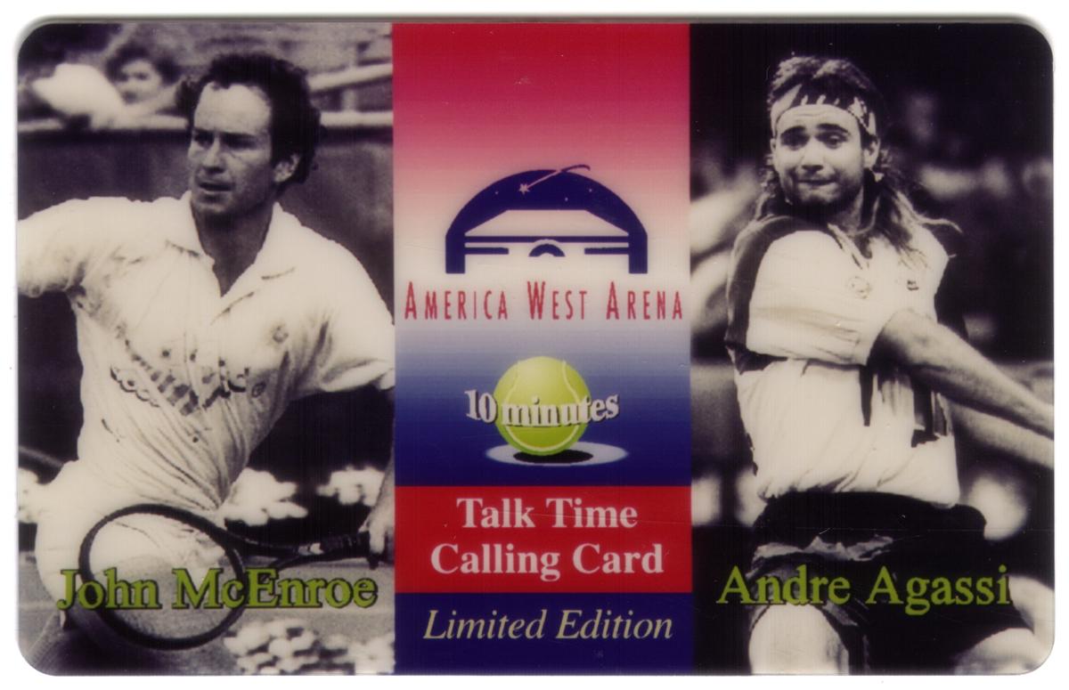 The card is branded as a Talk Time Calling Card issued by MCI, designed for usage at America West Arena in 1994. It celebrates the tennis sports category and highlights the sports celebrities John McEnroe and Andre Agassi, emphasizing their status as tennis legends.