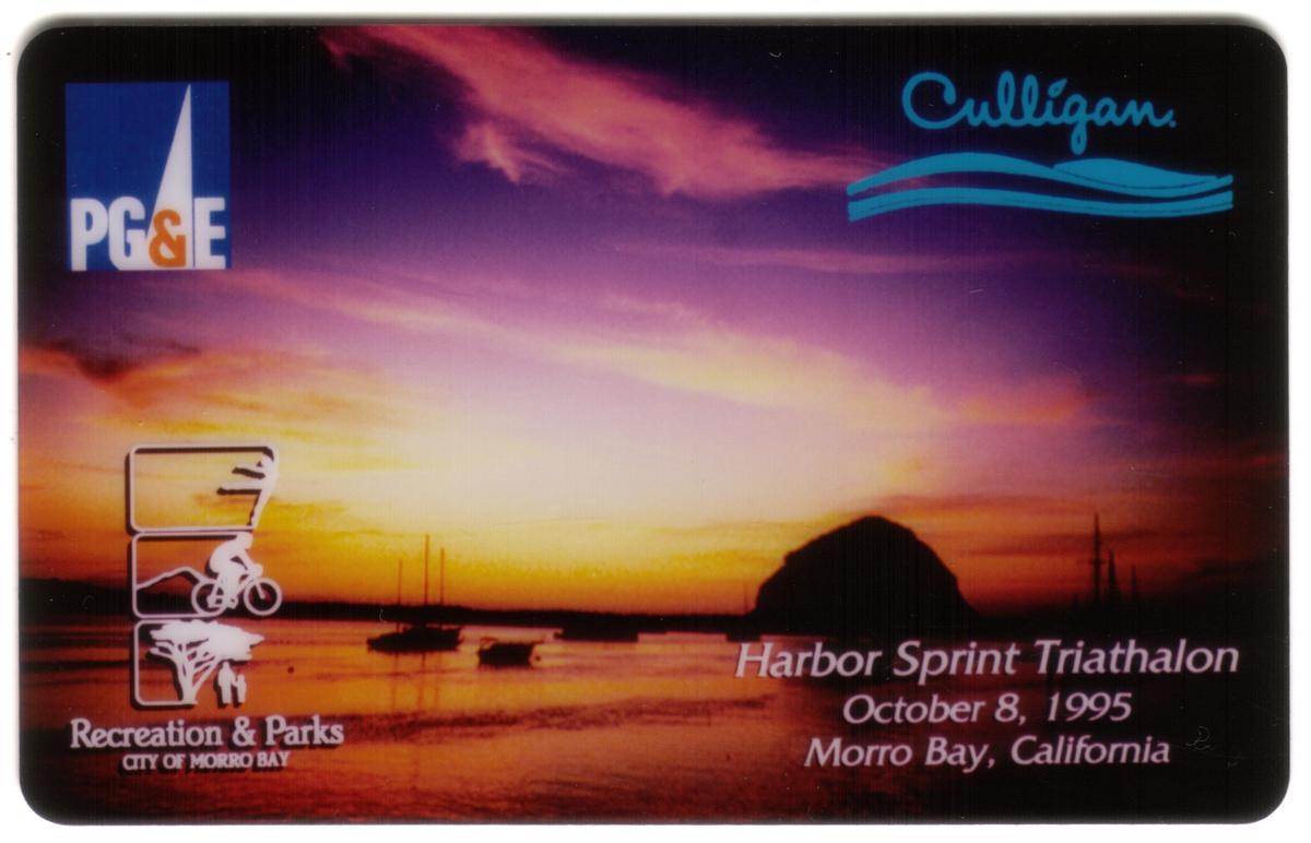 The card includes logos of Culligan and PG&E, representing sponsors of the triathlon event. The text on the card states "CA 10u 1995 Morro Bay CA Harbor Sprint Triathlon," directly linking the imagery and sponsorship to this specific athletic event. The design also includes a distinct Culligan logo positioned clearly on the card, along with the PG&E trademark, emphasizing the involvement of these companies.