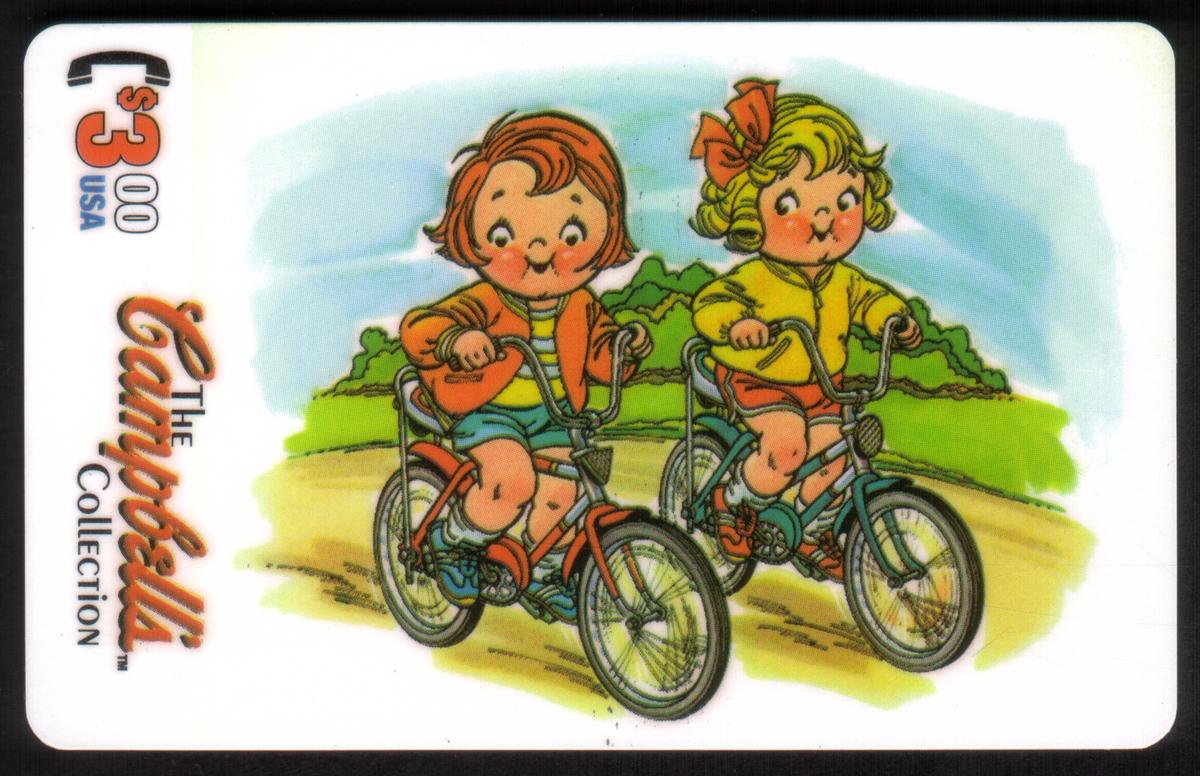 This collectible phone card from The Campbell’s Collection features an illustration of two children riding bicycles. The child on the left has short brown hair and is wearing an orange jacket, green shorts, and blue shoes while riding a red bicycle. The child on the right has blond hair tied with an orange bow and is dressed in a yellow jacket and red shorts, riding a green bicycle. Both children have rosy cheeks and happy expressions.