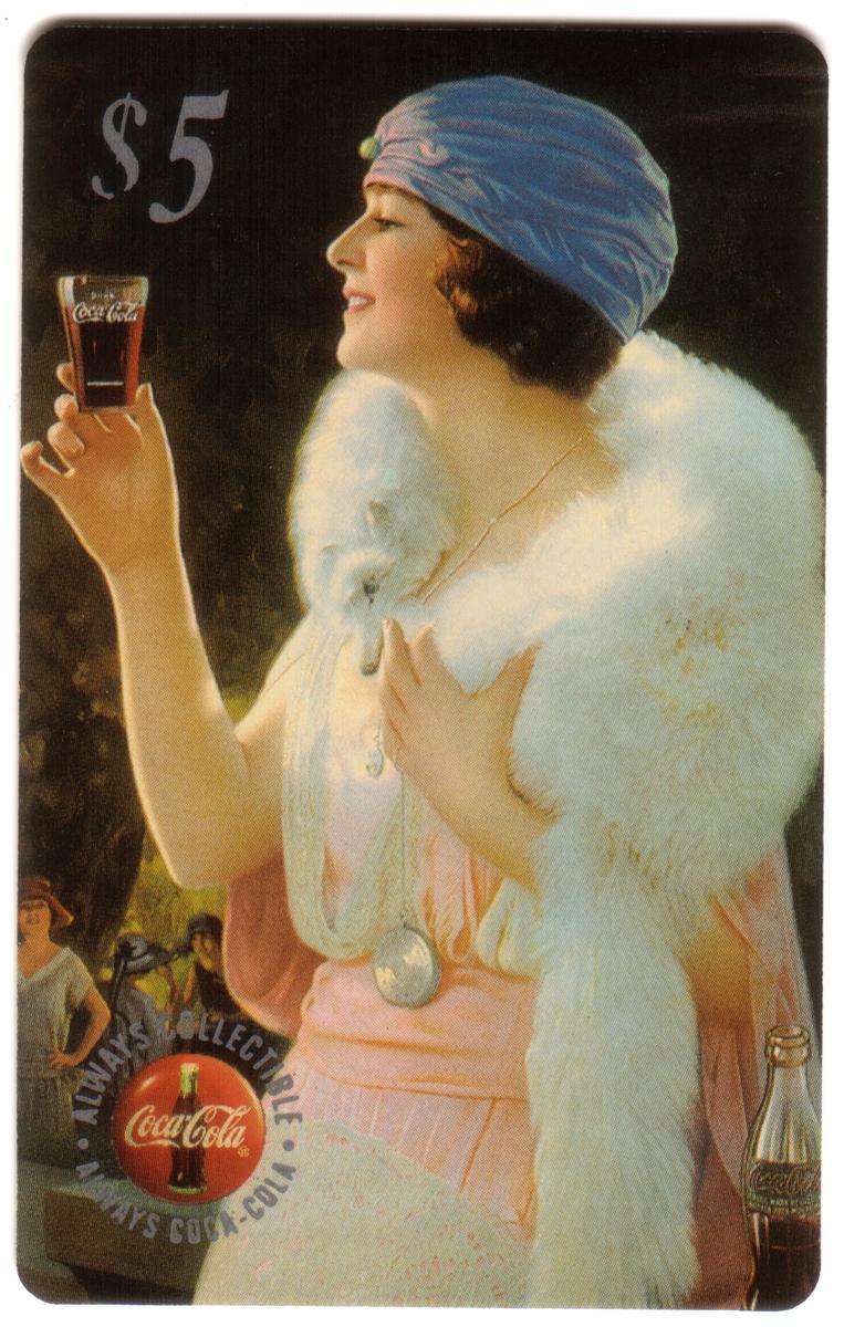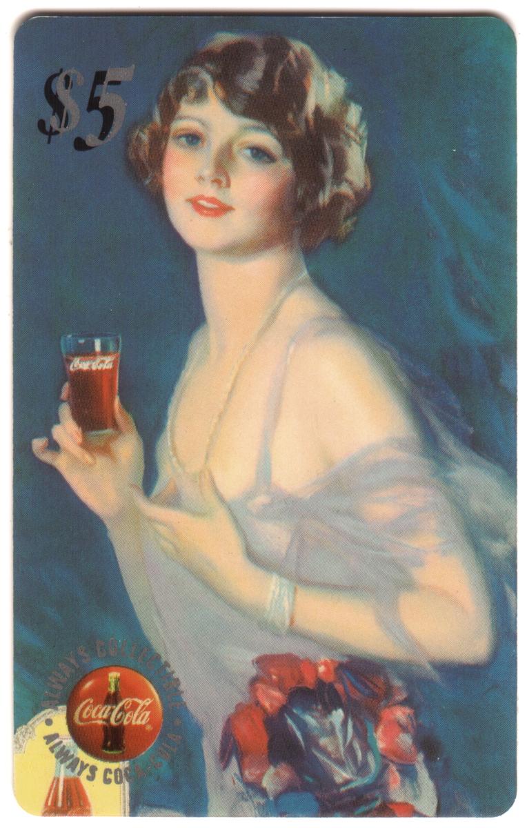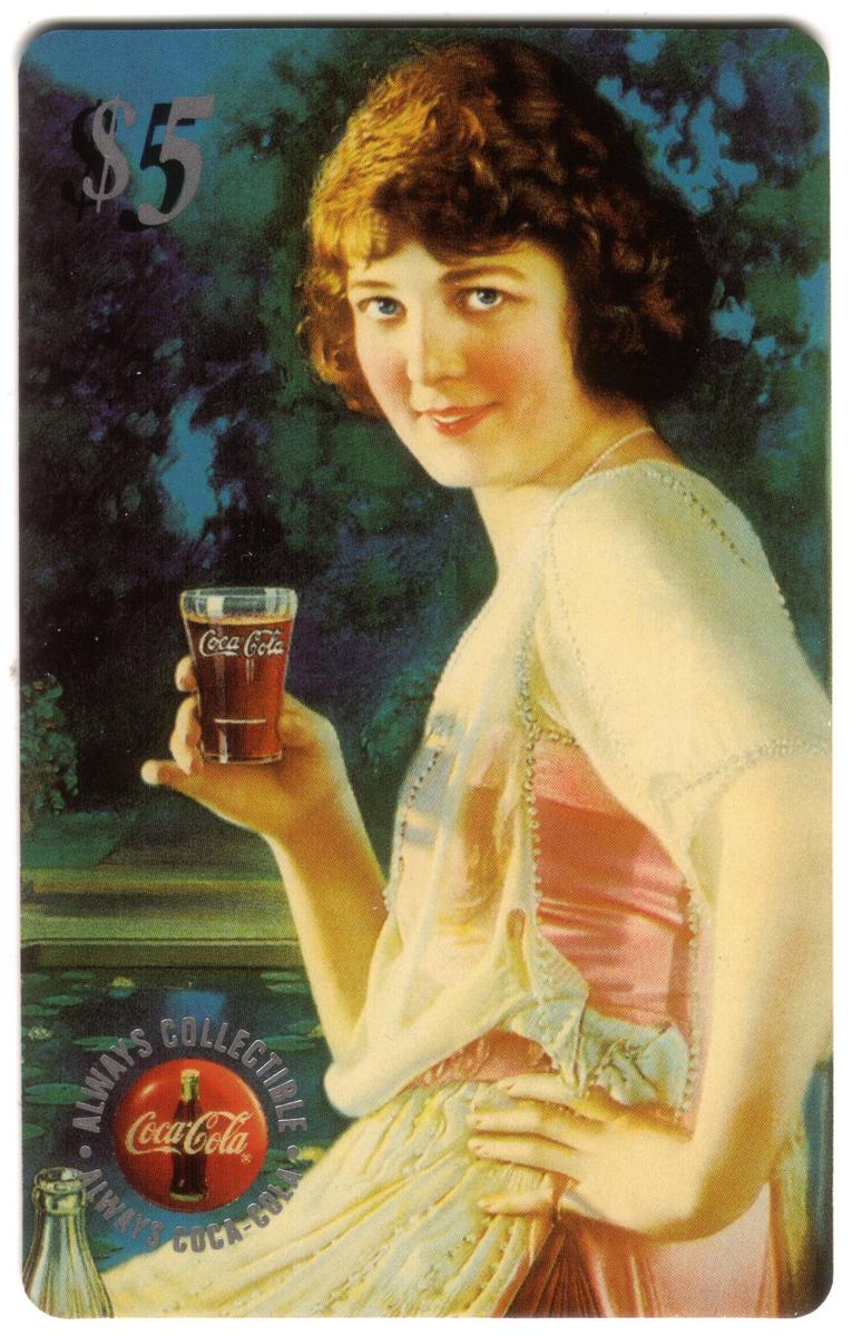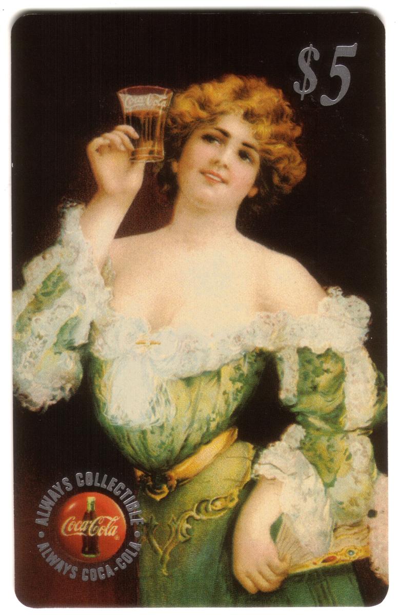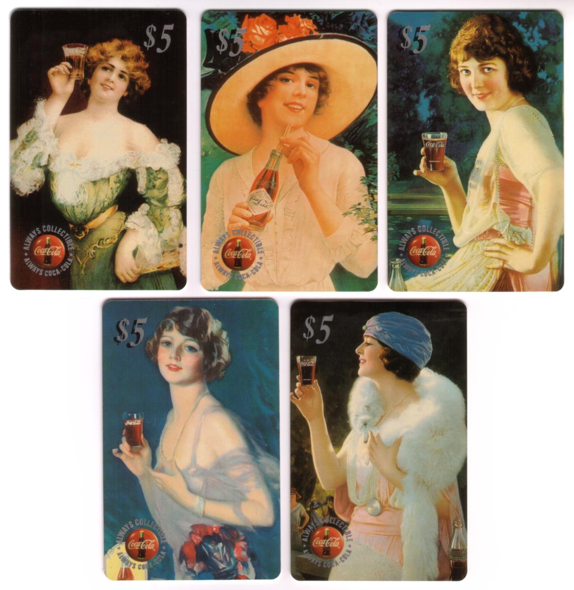 This complete set of five collectible cards features vintage Coca-Cola calendar girls from 1996, issued by The Score Board Inc. Each card has a $5 denomination printed in the top right corner. The artwork on the cards showcases women in early 20th century attire, holding and enjoying Coca-Cola beverages. The Coca-Cola logo appears prominently on each card alongside the text "ALWAYS COLLECTIBLE" and "ALWAYS COCA-COLA," emphasizing the collectible nature of these cards and their connection to Coca-Cola memorabilia.