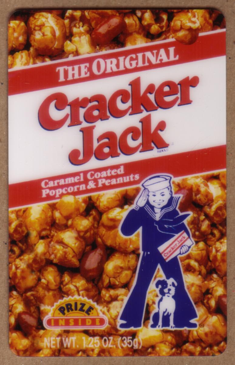 Toward the bottom right of the card is the classic Cracker Jack mascot, Sailor Jack, illustrated in blue and white. He is shown saluting with his right hand while holding a red and white box of Cracker Jack in his left arm. Next to Sailor Jack is the Cracker Jack dog, Bingo, also in blue and white, standing attentively.