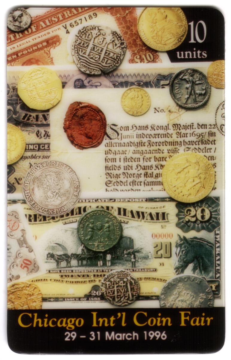 Commemorative card featuring ancient coins, banknotes, and currency fragments from the 1996 Chicago International Coin Fair, celebrating numismatic history and culture. |