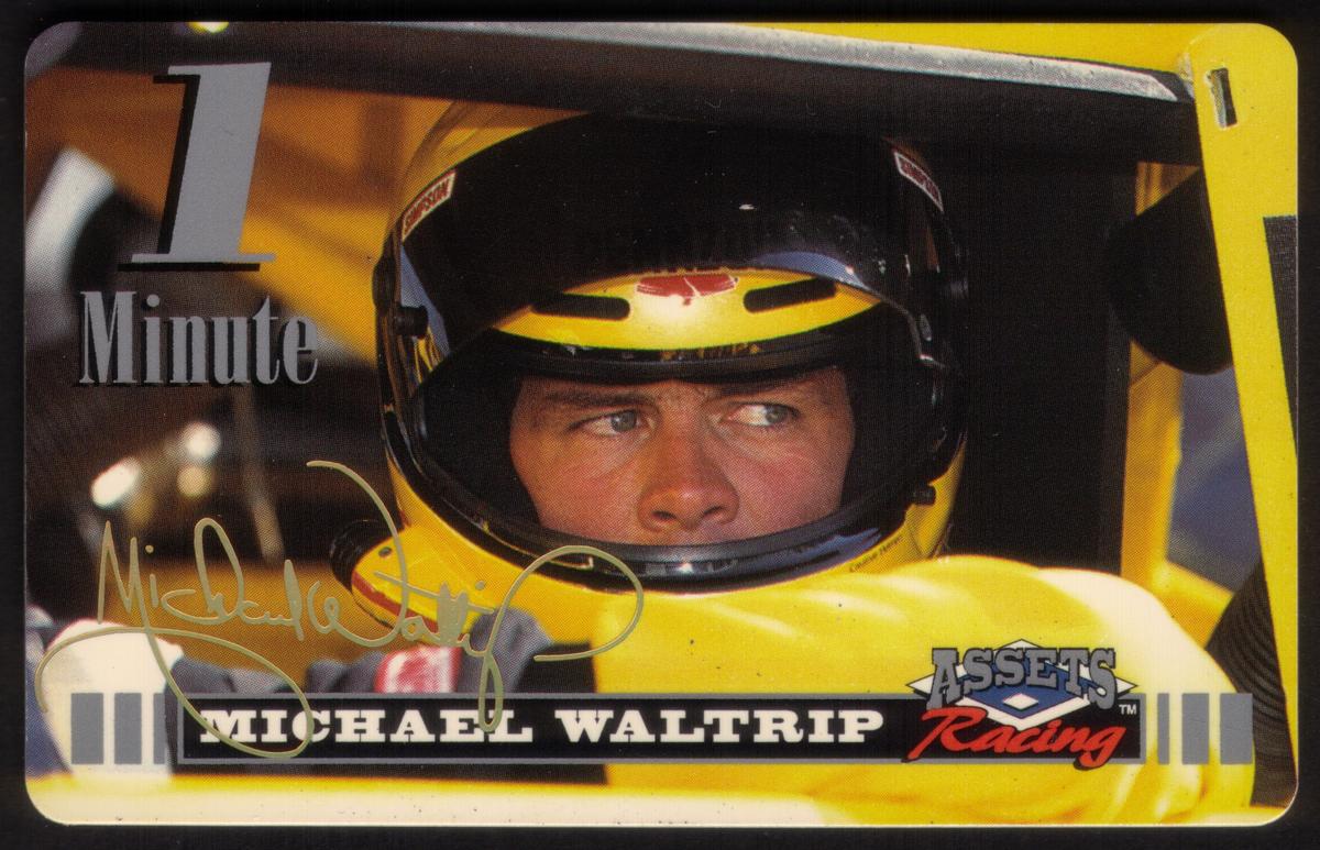 This collectible card features an image related to NASCAR and auto racing, specifically highlighting Michael Waltrip. The card displays a racing car prominently on the track, surrounded by elements typical of an automotive race setting. The design includes a printed signature of Michael Waltrip, confirming his association with the card.