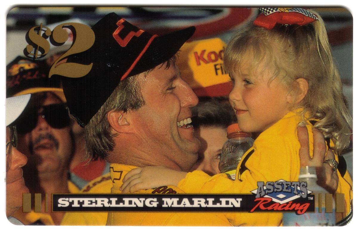 The card's design centers on Sterling Marlin and the young girl, with “Assets Racing 1995: $2” noted as part of the card’s title or description. The image reflects a moment of celebration, underscoring human connection within the competitive atmosphere of NASCAR. The photographic quality of the image is clear, showing the subjects in natural lighting. Brand names and corporate logos feature prominently, consistent with official race sponsorship and marketing materials from the mid-1990s racing scene.