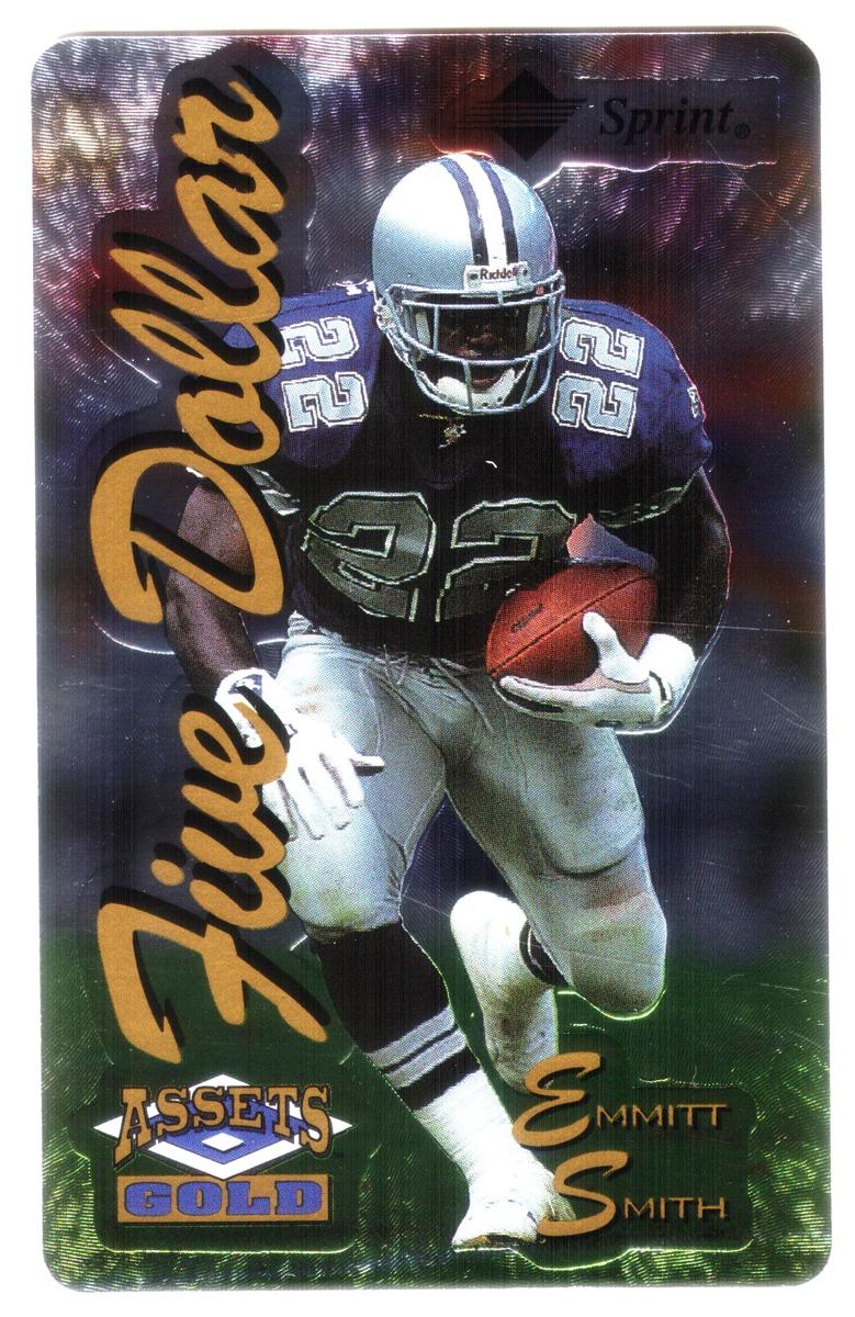 This collectible phone card features a photographic image of Emmitt Smith, wearing his Dallas Cowboys uniform with the number 22 on his jersey and helmet. He is shown in action, running with a football tucked under his right arm while looking ahead. Smith wears white gloves and white pants with a navy blue strip. The background is a dynamic mix of dark and light shades, providing contrast to his figure.
