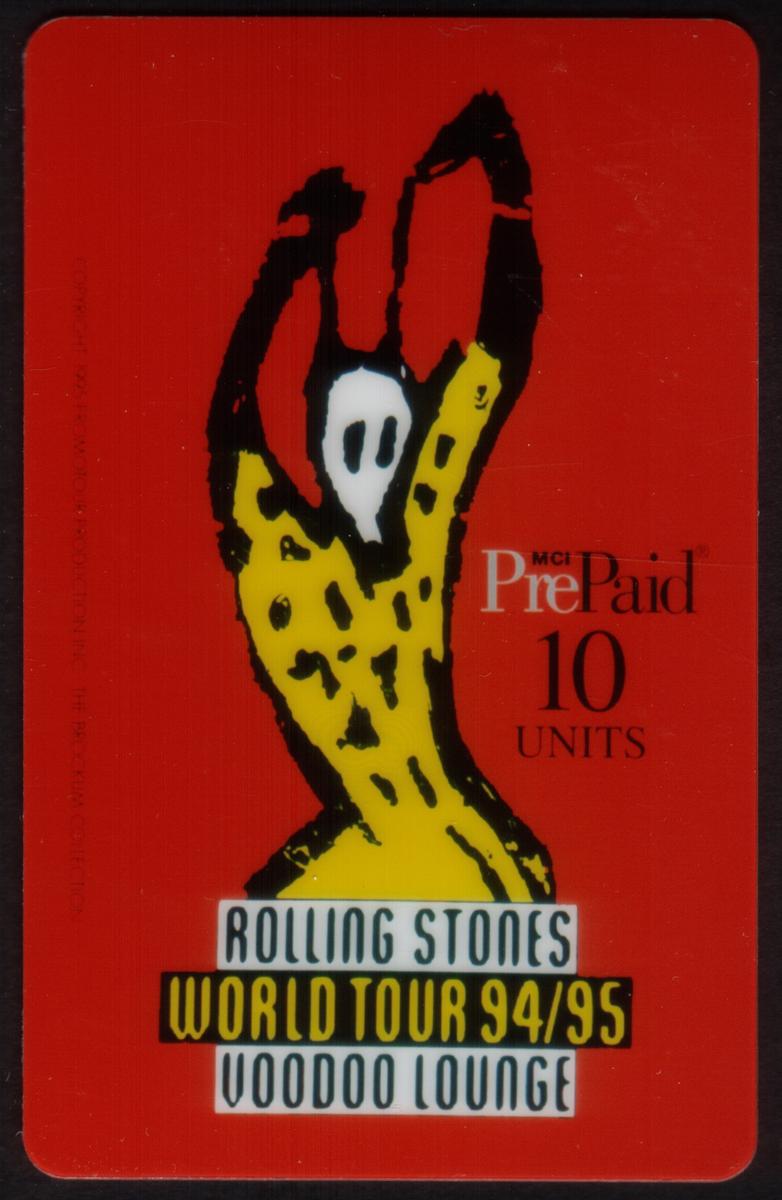 The second card has a vibrant red background with a stylized figure wearing a yellow patterned outfit and a skull mask, raising their arms. Below the figure, text reads: "ROLLING STONES WORLD TOUR 94/95 VOODOO LOUNGE." The card similarly shows "10 UNITS" and "MCI PrePaid."