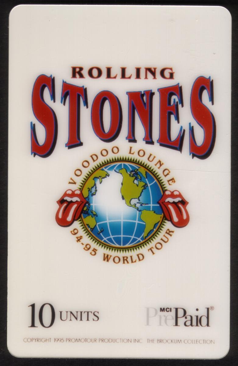 The third card is white with a centered globe graphic flanked by two red tongue logos on both sides. Above the globe, the large text "ROLLING STONES" is displayed, arching over the words "VOODOO LOUNGE." Below the globe, the text states "94-95 WORLD TOUR." The "10 UNITS" designation and "MCI PrePaid" appear near the bottom.