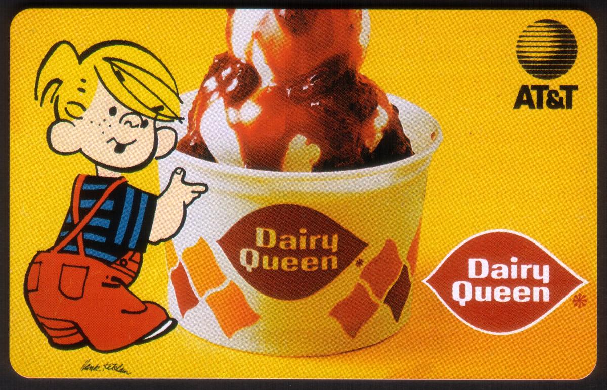 This combination of the Dairy Queen brand and Dennis the Menace character ties into a promotional theme, highlighting a popular ice cream product with the familiar comic strip figure appealing to fans of classic cartoons. The card is a collectible piece linking Dairy Queen’s frozen treat offering with AT&T’s phone service promotions.