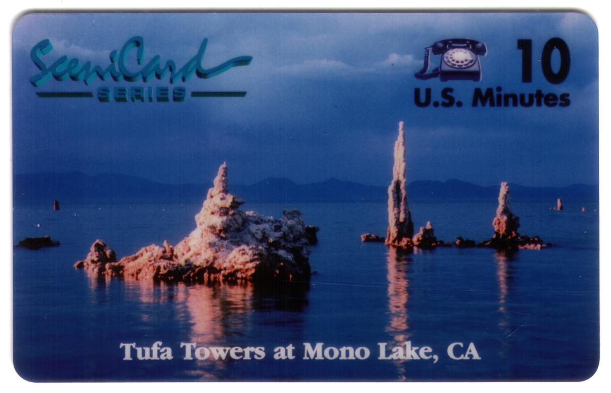 This collectible phone card features a photographic image of the Tufa Towers at Mono Lake in California. The scene depicts a group of tall, naturally formed rock towers rising from the water’s surface. The formations are rugged and irregular, characteristic of tufa, a type of limestone created by the precipitation of carbonate minerals from lake water. The surface of the water is calm, reflecting parts of the sky above.