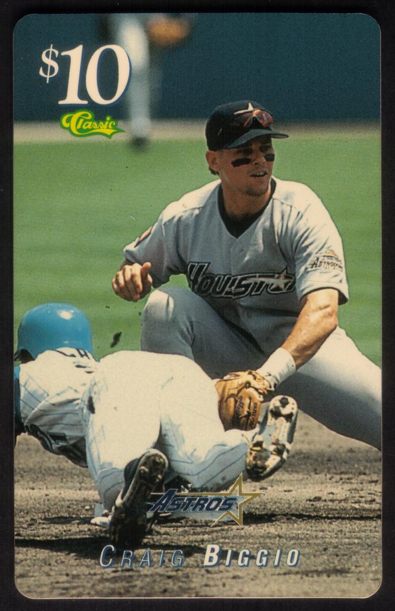 The upper left corner displays the denomination of $10 in white text, with a small green and yellow “Classic” logo beneath it. This collectible card dates to 1995 and is issued as a pin without a scratch-off coating. It is associated with Major League Baseball and specifically represents Craig Biggio of the Houston Astros.