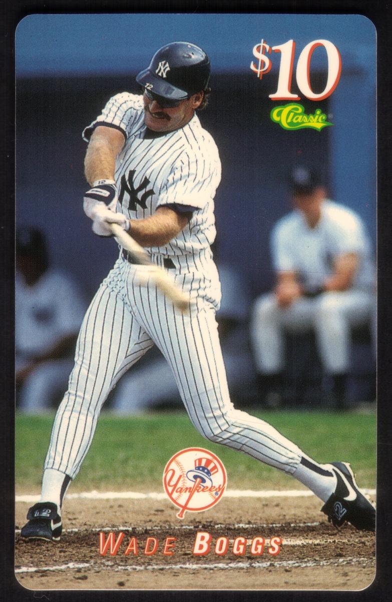 At the bottom portion of the card, the text “Major League Baseball (MLB) Wade Boggs, Yankees” is printed, clearly identifying the player and team. The card is issued without a scratch-off coating over the pin, preserving the image and text clearly visible. This item serves as a collectible piece for baseball fans and phone card collectors, linking sports memorabilia with telecommunications collectible cards.