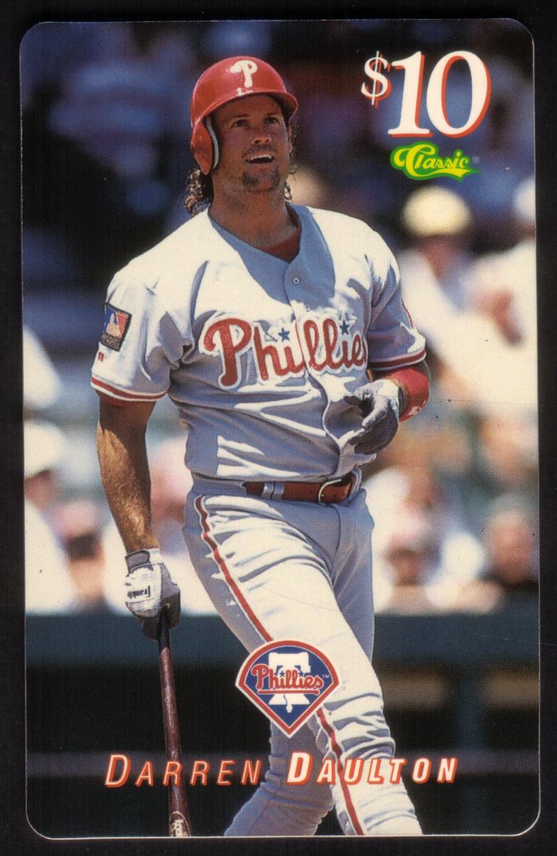 The card carries a $10 denomination, printed clearly on the front. It is issued without a scratch-off coating over the pin number, which is not visible on the card. The overall design incorporates baseball imagery to celebrate Darren Daulton's career in Major League Baseball during the mid-1990s.