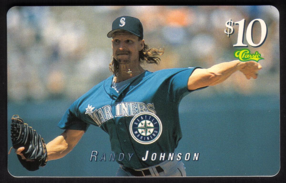 1995 $10 baseball phone card featuring Randy Johnson in Mariners uniform mid-pitch, showcasing his fierce style, iconic look, and 90s baseball history. |