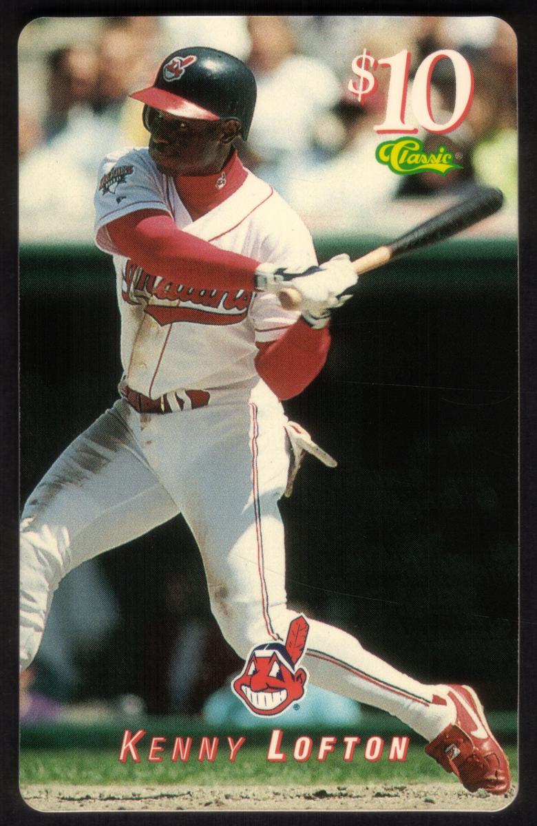 Kenny Lofton is shown in the midst of an action pose related to baseball. The card’s design incorporates the MLB logo and emphasizes the sports theme, highlighting professional baseball and players from that era. The card has a value of $10 indicated on the front, with no scratch-off coating, as issued.