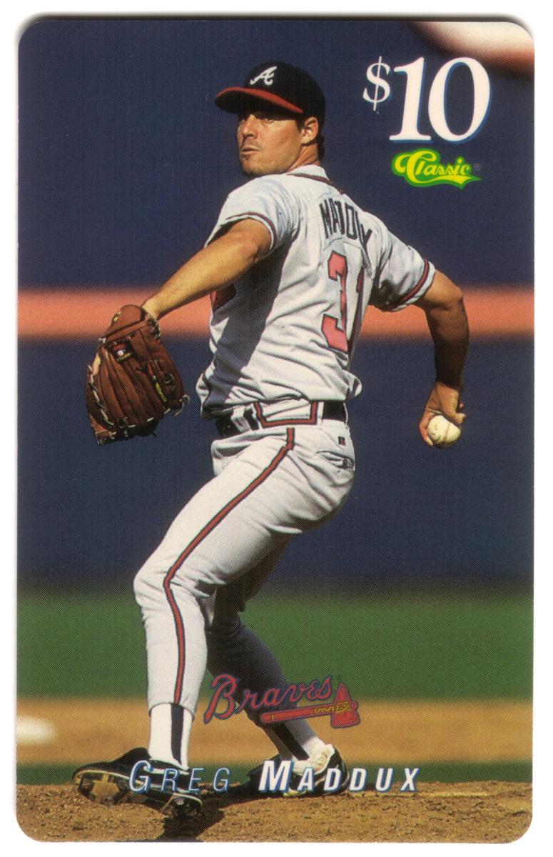 The card has prominent text identifying the player’s name, “Greg Maddux,” and the team, “Braves,” on the front. The official Major League Baseball logo is displayed on the upper left corner, signifying its licensed status. The card is issued by The Score Board Inc., as indicated at the bottom of the design. At the upper right corner, the card’s value is marked as $10. The overall design utilizes a combination of white, blue, and red colors aligning with the Atlanta Braves’ team colors.