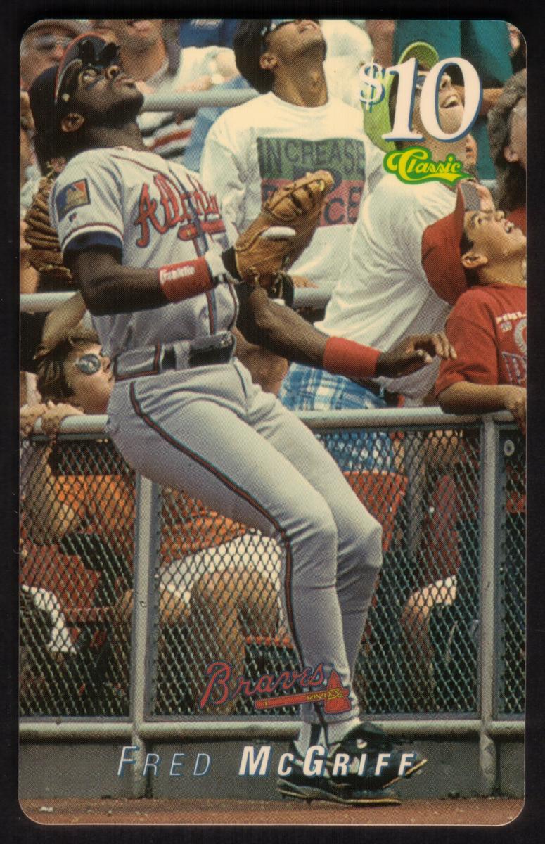 This card is valued at $10 and is issued without any scratch-off coating, highlighting its nature as a collectible rather than an interactive or promotional item. It stands as a piece representing the 1995 Major League Baseball season and Fred McGriff’s career with the Atlanta Braves.