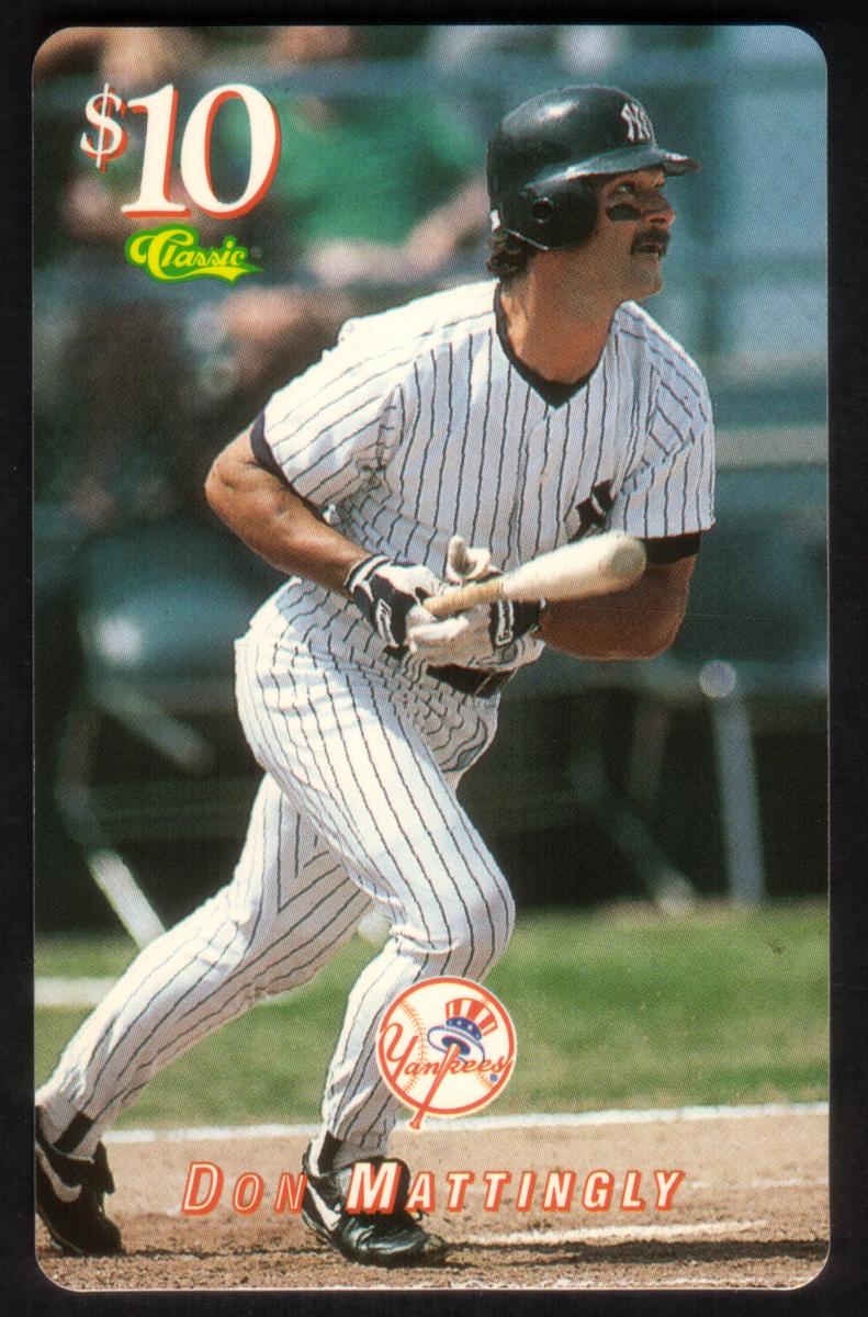 This collectible card features Don Mattingly, a prominent Major League Baseball player known for his time with the New York Yankees. The card highlights Mattingly in a classic baseball pose, emphasizing his connection to the sport with a baseball bat and ball clearly visible. The imagery and design focus on the 1995 MLB season, portraying Mattingly in his Yankees uniform.