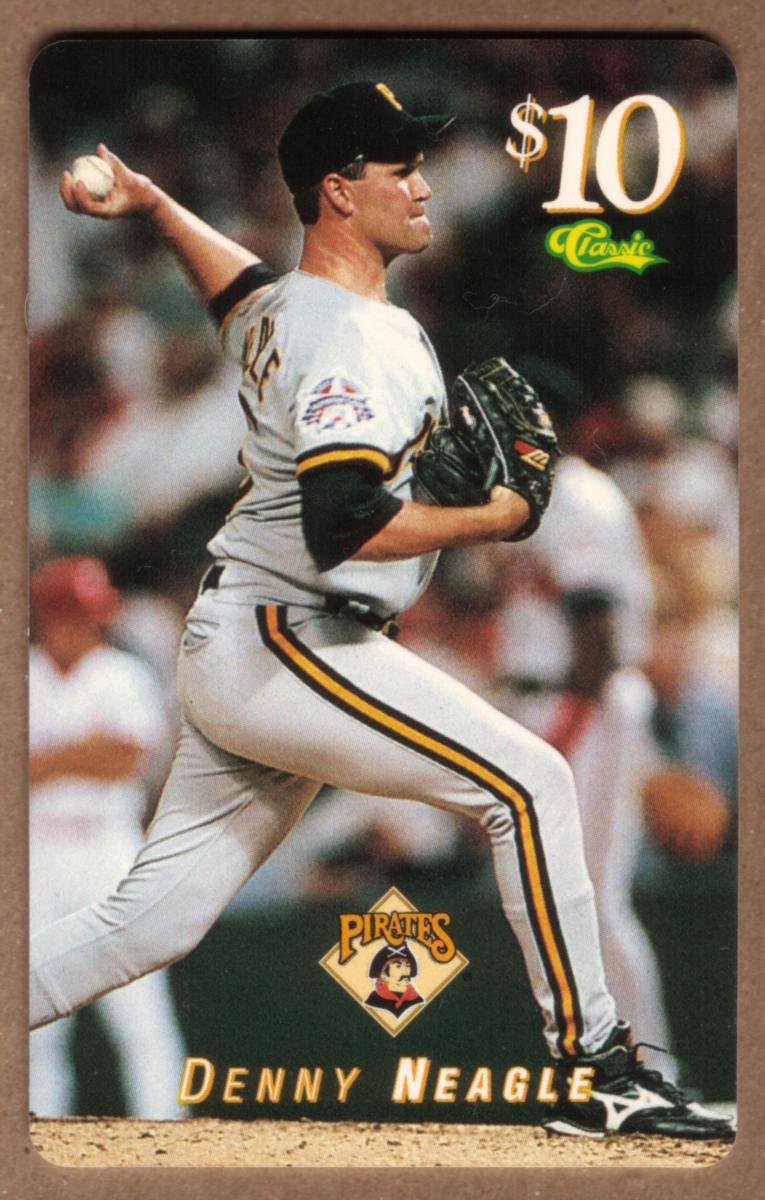 Denny Neagle in Pittsburgh Pirates uniform mid-pitch, $10 value, vibrant team logo, dynamic action shot, balancing collectible appeal with practical phone card features. |