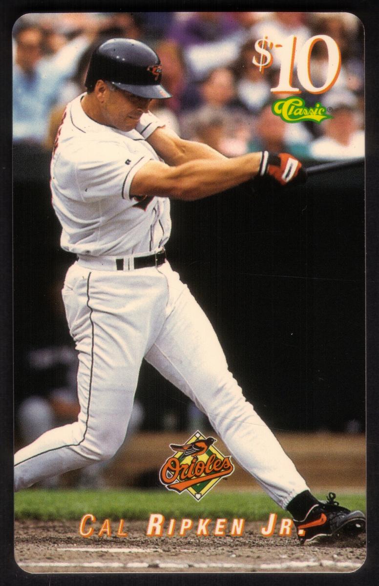 The card prominently displays the player’s name, “Cal Ripken, Jr.,” as well as his sport, baseball, and his league affiliation—Major League Baseball (MLB). The design integrates traditional baseball elements such as crossed bats and imagery related to the sport. The card is issued by The Score Board Inc. and is valued at $10. There is no scratch-off coating over the pin on this card.