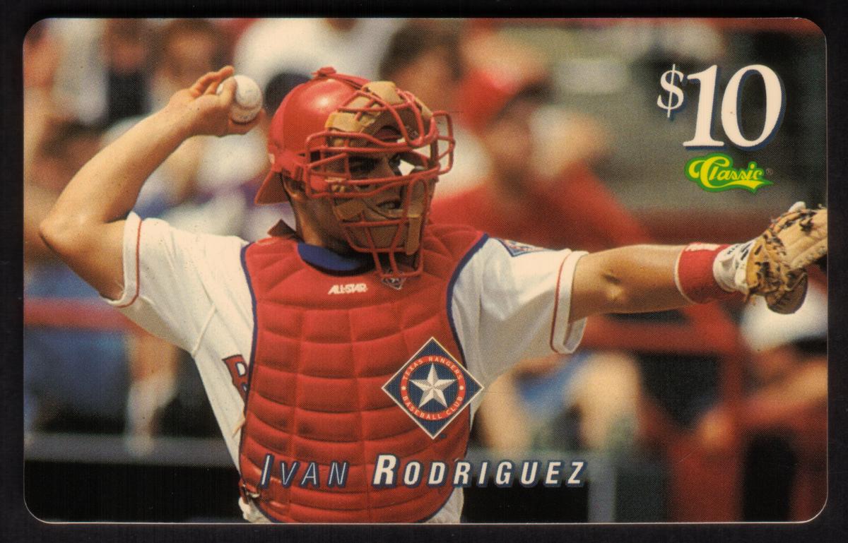 This collectible communicates its sports theme strongly through visual elements and text related to baseball and the MLB. Ivan Rodriguez’s name is prominently displayed, anchoring the card’s identity to the player and the 1995 Texas Rangers team, making it a notable item for collectors interested in baseball memorabilia.