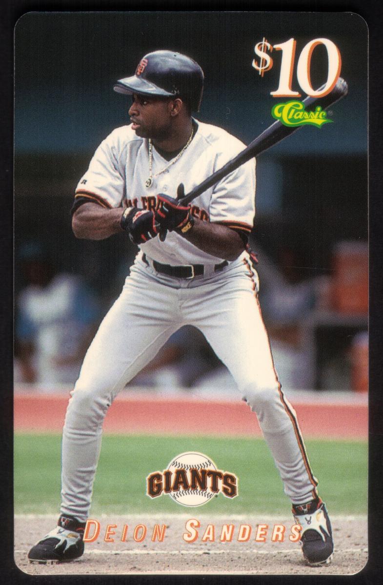 This collectible card features Deion Sanders in his San Francisco Giants baseball uniform. He is shown in a batting stance, gripping a baseball bat with both hands while looking toward the pitcher. Sanders wears a black batting helmet with the Giants logo on the front. His uniform is white with "SAN FRANCISCO" written across the chest in orange and black letters, and black and orange trim on the sleeves. The card shows Sanders wearing black batting gloves and cleats with white and black details.