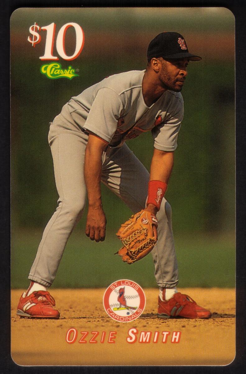The card prominently displays the Major League Baseball (MLB) branding along with references to the St. Louis Cardinals, highlighting the player’s team affiliation. Text elements include the player’s name “Ozzie Smith,” the year “1995,” and identifiers related to the MLB licensing. The card does not have a scratch-off coating and is associated with a $10 denomination, as printed on the card.