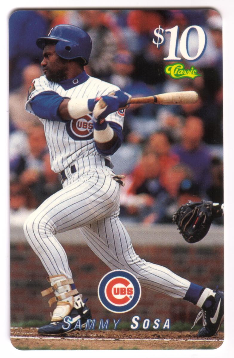 The card is valued at $10, indicated in the top right corner in white text with the word "Classic" in green script beneath it. The Chicago Cubs logo appears centered at the bottom of the card above Sammy Sosa’s name, which is written in all capital letters in a white font with a blue outline. The image captures the dynamic moment of Sosa’s swing with detailed action and focus on the player.