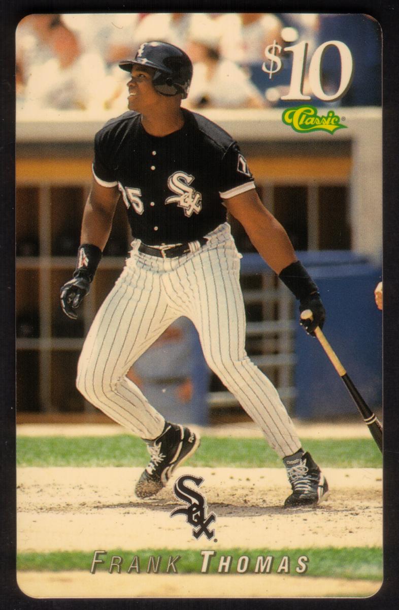 Text on the card indicates a $10 denomination, presented without any scratch-off coating over the pin. This detail emphasizes the card’s collectible nature and value. Overall, the card is a distinctive piece celebrating Frank Thomas’s career and his place in Major League Baseball history during the mid-1990s.