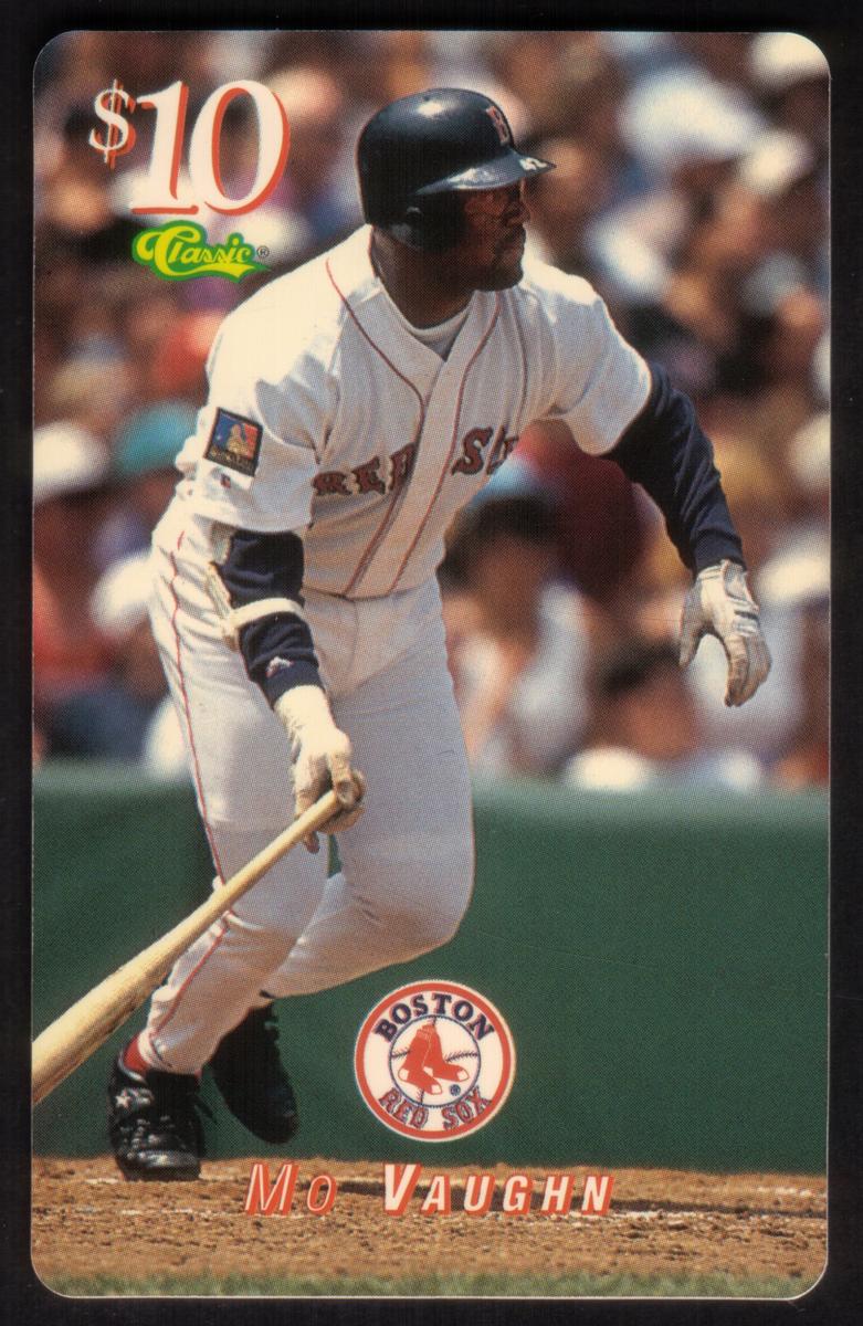 This collectible features Mo Vaughn, a Major League Baseball (MLB) player who played for the Boston Red Sox. The image captures Vaughn in a batting pose, holding a baseball bat, wearing a white uniform with "Red Sox" visible on the front. The setting is a baseball field, and the card has the Major League Baseball logo clearly displayed.