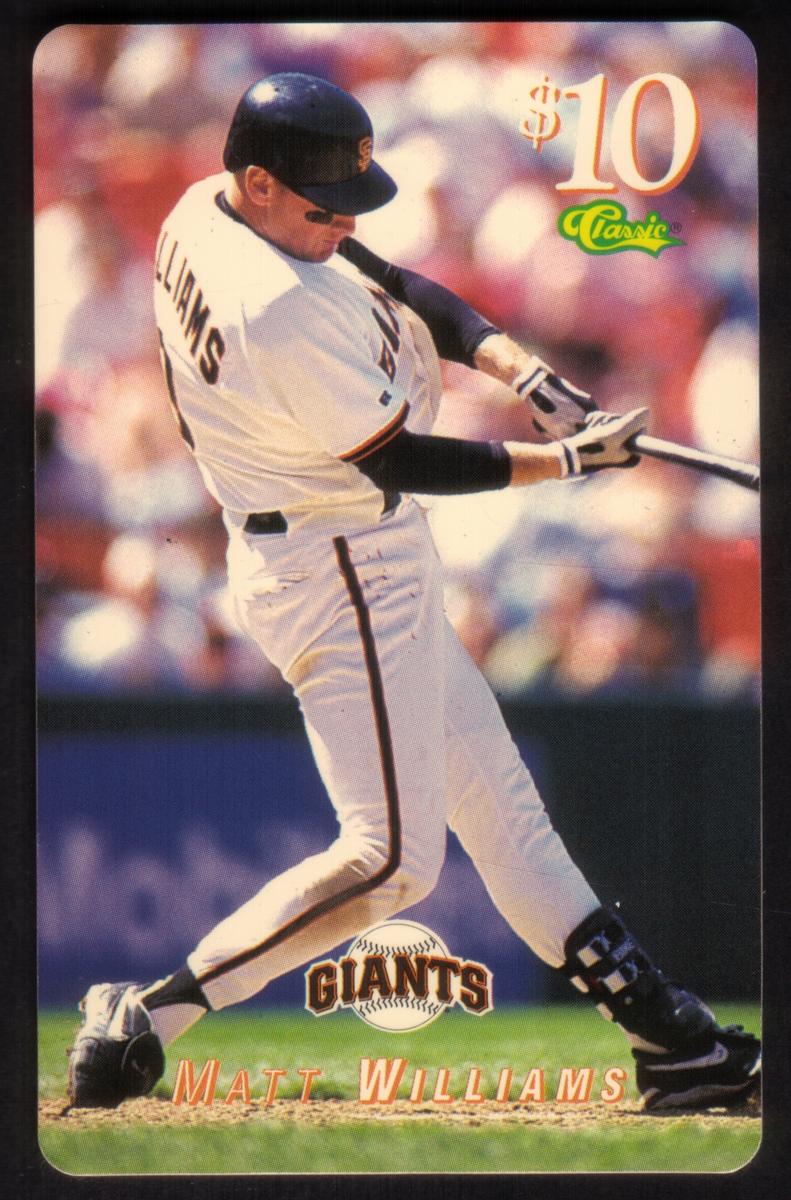 The background of the card highlights the MLB and San Francisco Giants branding, clearly connecting the player to the iconic baseball team. The image captures a strong, action-oriented depiction of Matt Williams, representing his role as a key player in the league during that season.