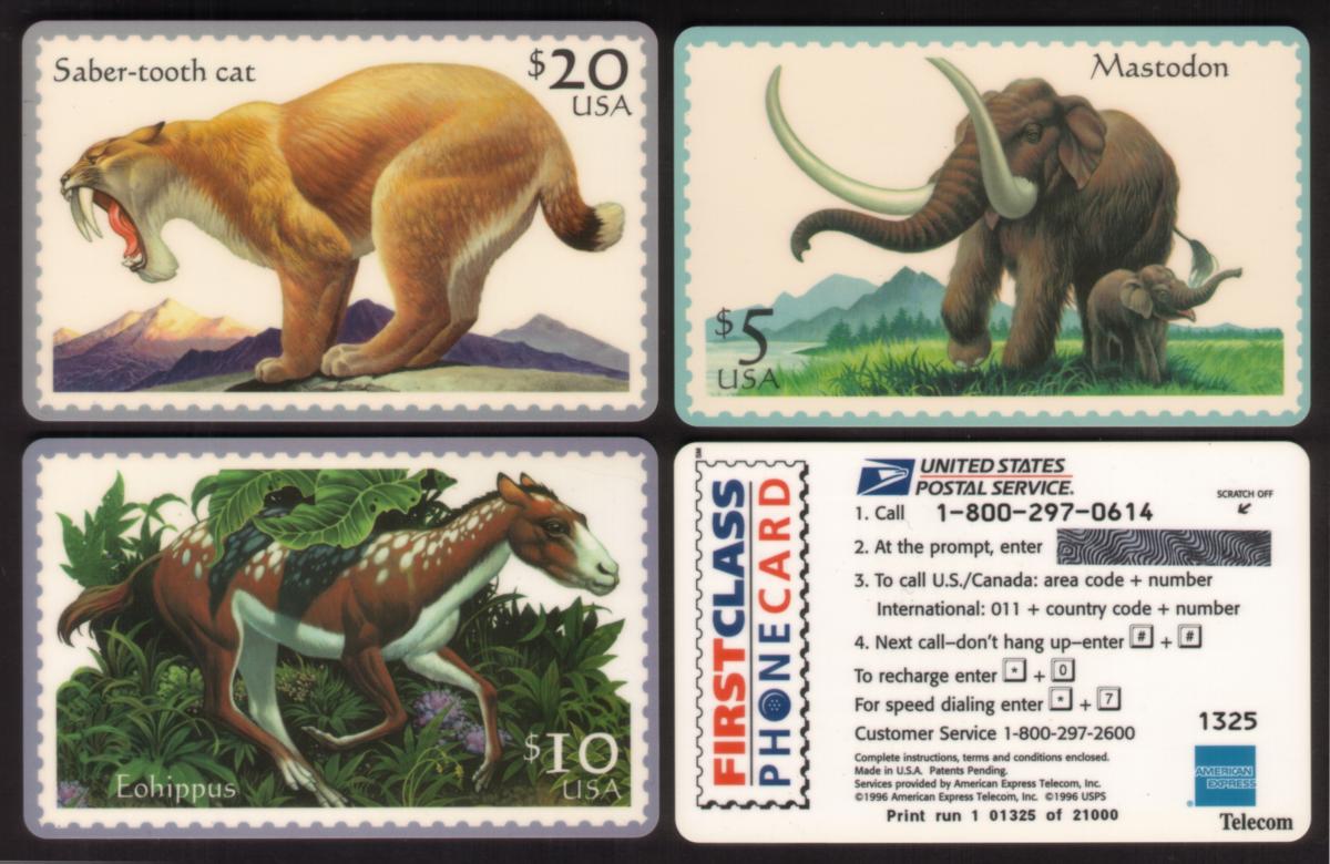 Together, these three cards form a prehistoric animals set highlighting the Mastodon, Eohippus, and Saber-tooth Cat, issued by USPS in collaboration with Amex Telecom. Each card is designed with a golf scalloped edge pattern around the image and printed denominations of $5, $10, and $20 respectively.