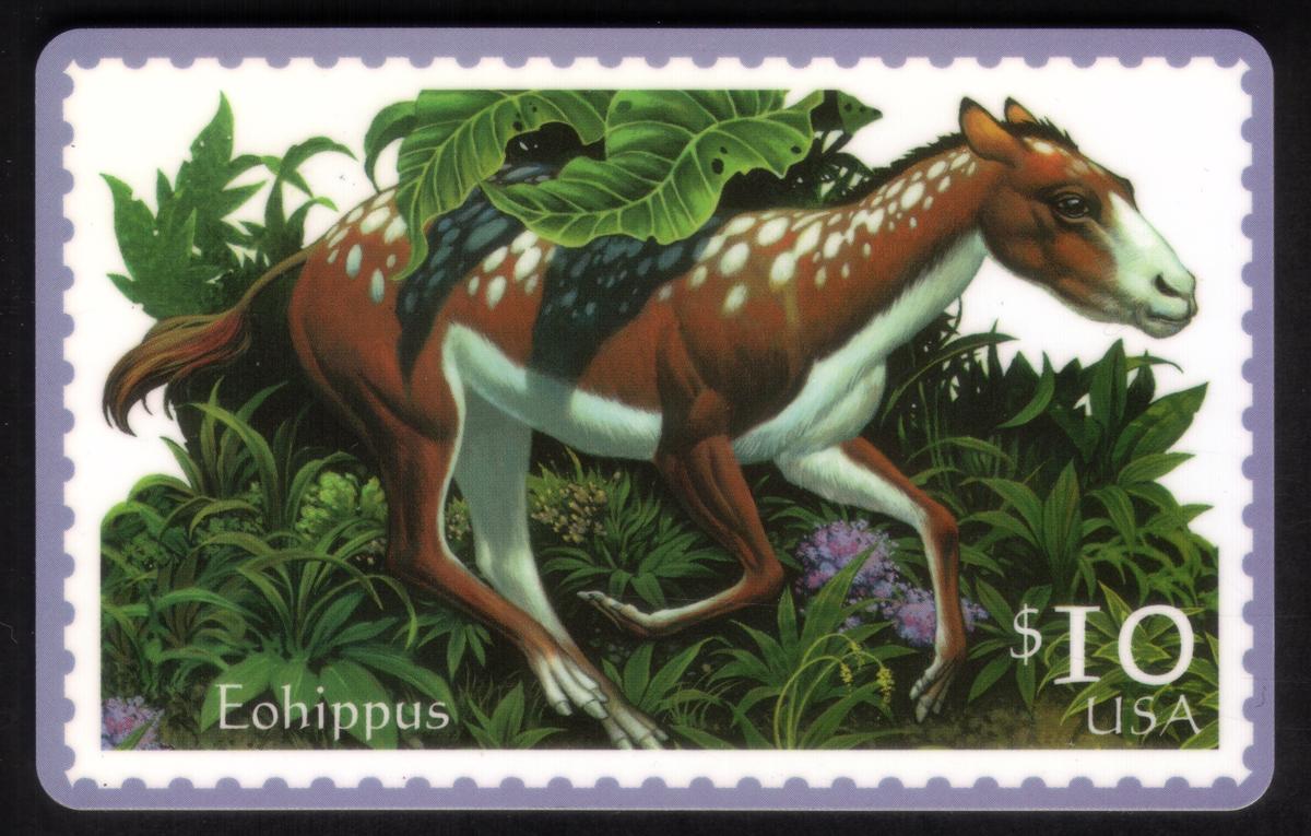 The second card depicts an Eohippus, an early prehistoric horse, set in dense green foliage with large leaves and flowering plants. The Eohippus is illustrated in mid-stride with brown and white spotted fur and a white underbelly. This card’s border is dark purple, with the denomination "$10" and "USA" printed in the bottom right corner and the name "Eohippus" toward the lower left.