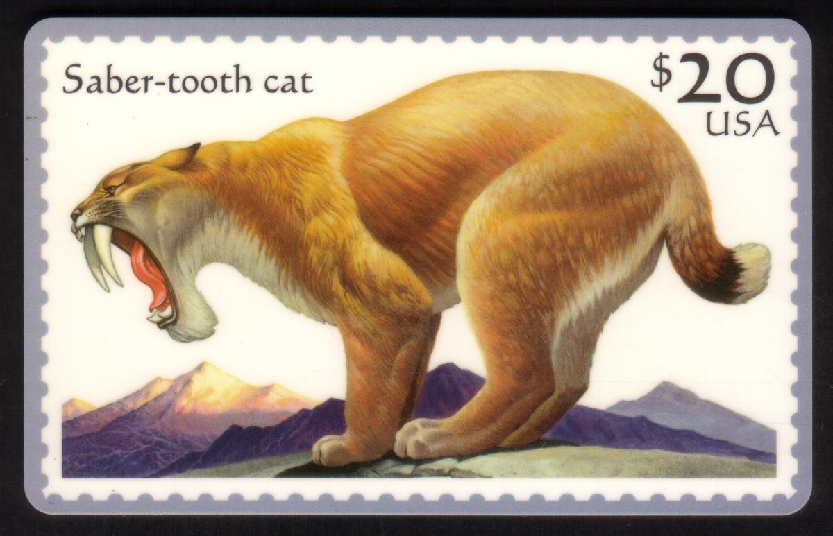 The third card features a Saber-tooth Cat in profile, showing its distinctive long, curved canine teeth and roaring expression. The cat’s fur is a mix of orange and light brown shades with a white-tipped tail, positioned on a rocky area with purple-hued mountains in the background. The top left corner includes the label "Saber-tooth cat," and the card’s value "$20," along with "USA," is printed in the upper right corner.