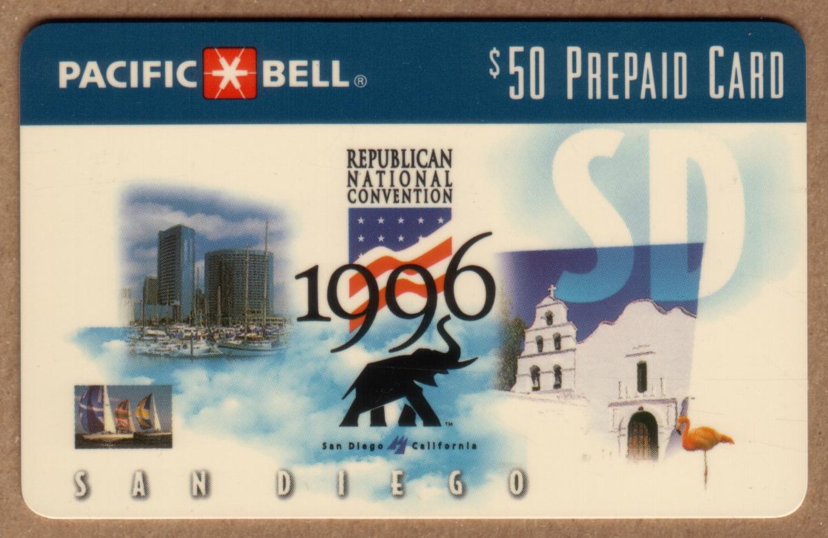 Pacific Bell $50 prepaid card featuring the 1996 Republican National Convention in San Diego, with city landmarks, political symbols, and regional imagery. |