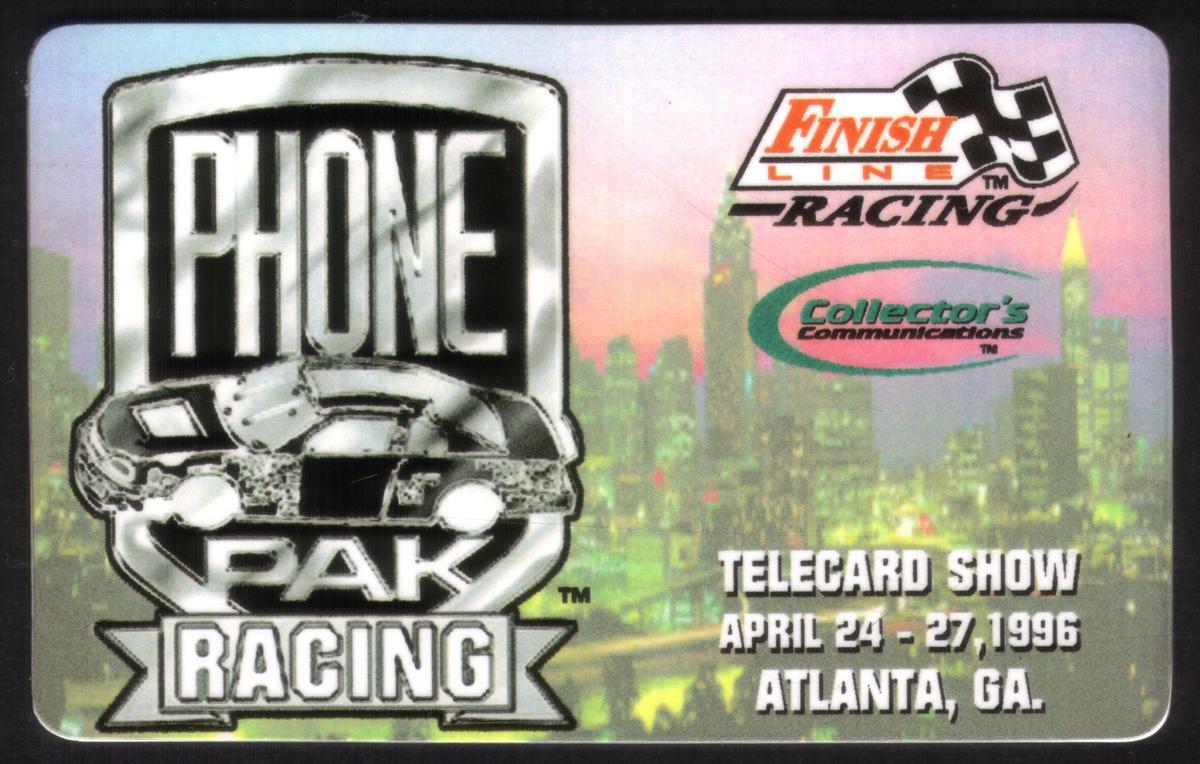 Keywords: Sports: Auto Racing, Telecard events, expos, show cards, NASCAR, cars, autos, automobiles, automotive, corporate trademarks, logos, brand names, telecard show, atlanta skyline, collector's communications, telecard world 1996, Finish Line Racing