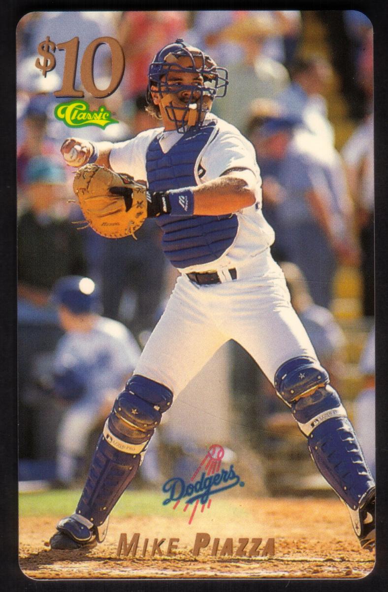 Mike Piazza in Dodgers gear, dynamic action shot, $10 denomination, Classic logo, Dodgers script, gold name, vintage sports collectible design. |